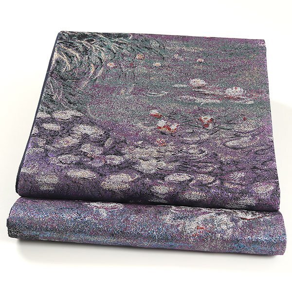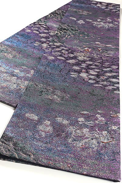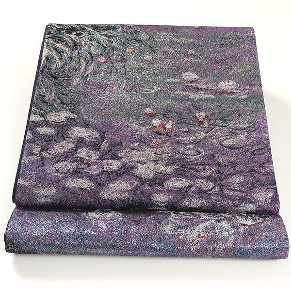 全体には白色、黒色、青色、緑色、赤糸、金の箔糸などで、クロードモネの代表作である睡蓮にインスピレーションを得た模様が織り上げられております。