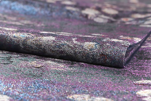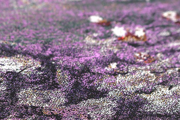 ややハリのあるキラキラのラメのような糸がふんだんに施された帯地は深紫色系のお色目でございます。