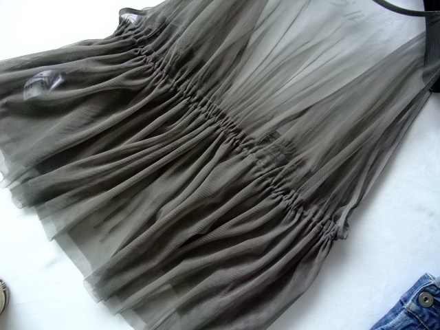 Product name: 訳ありサンプル品文字記載あり★ジーナシス★透け感チュールギャザーデザインベストブラウスカーディガン★M~Lカーキーグレー