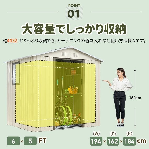 • ◎01大容量でしっかり収納 約4132Lとたっぷり収納でき、ガーデニングの道具入れなど使い方は様々です。6×5FT 194*162*184cm約4132Lの大容量