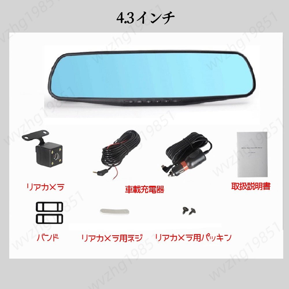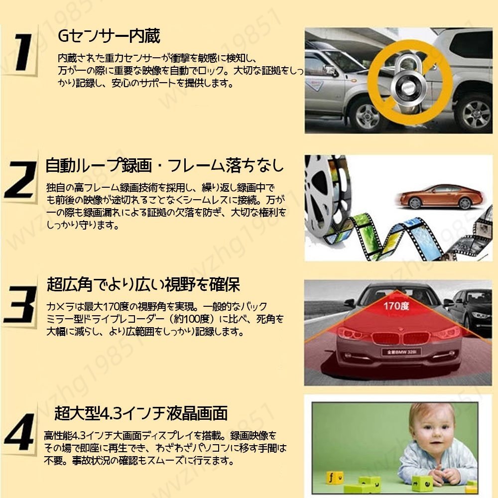 ドライブレコーダー 前後カメラ 170度超広角 ミラー型 操作簡単 動体検知 Gセンサー 4.3インチ液晶画面 三軸重力感知 上書き録画 緊急録画
