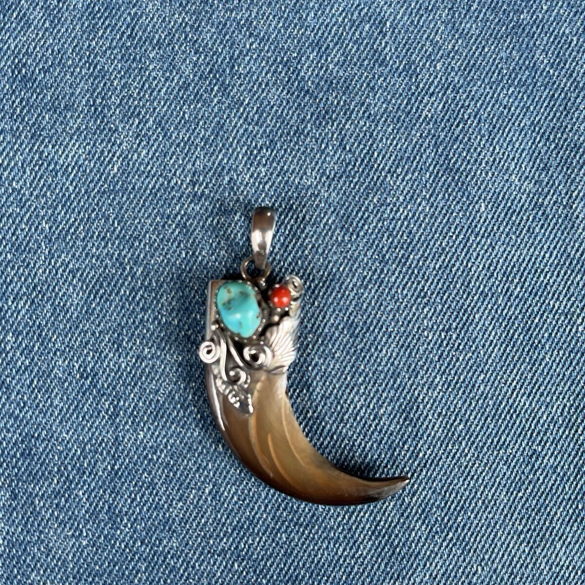 インディアンジュエリーのペンダントになります。ヒヅメ、ターコイズ、サンゴ等が飾られいます。シルバー製です。サイズは縦約6cm、横約4cmになります。
