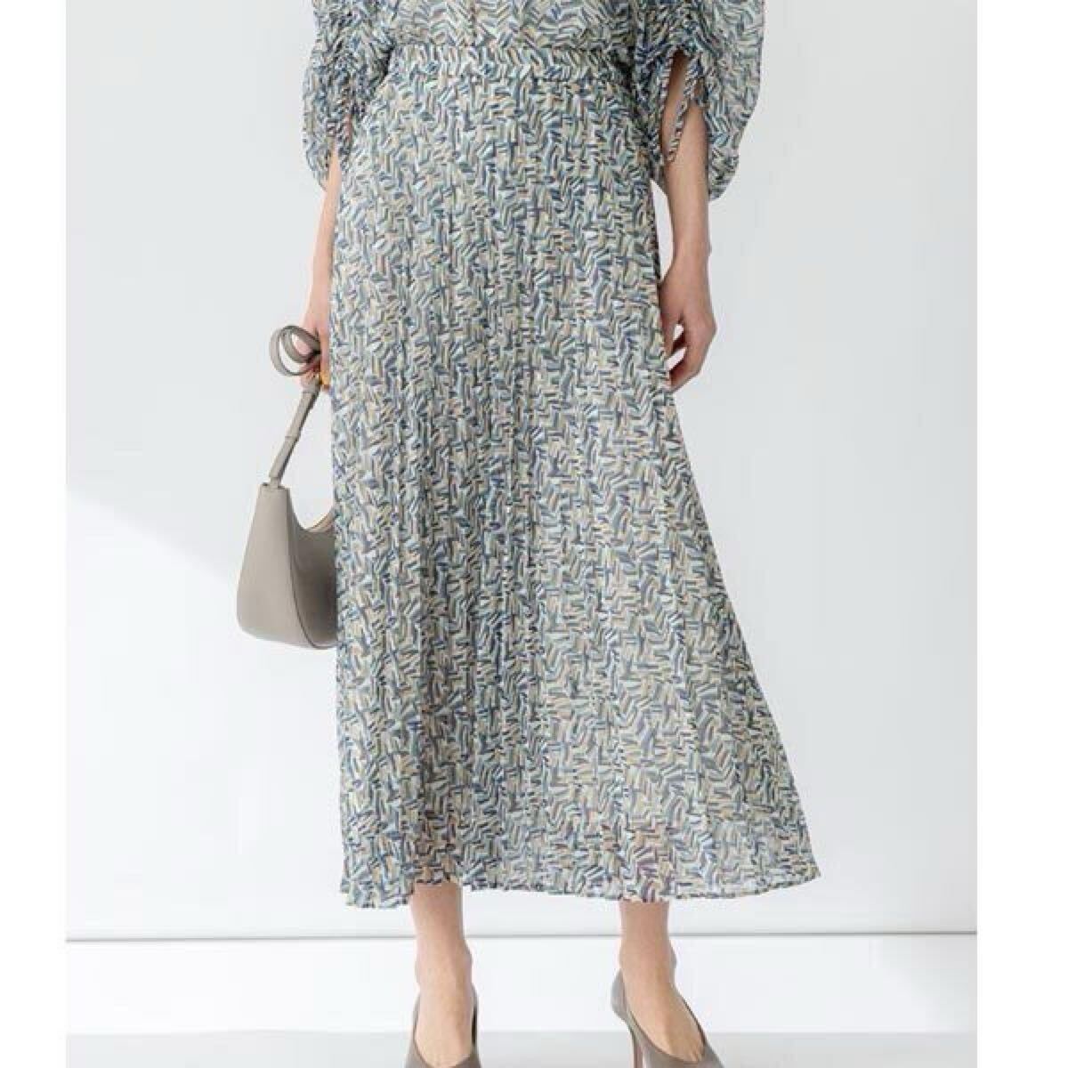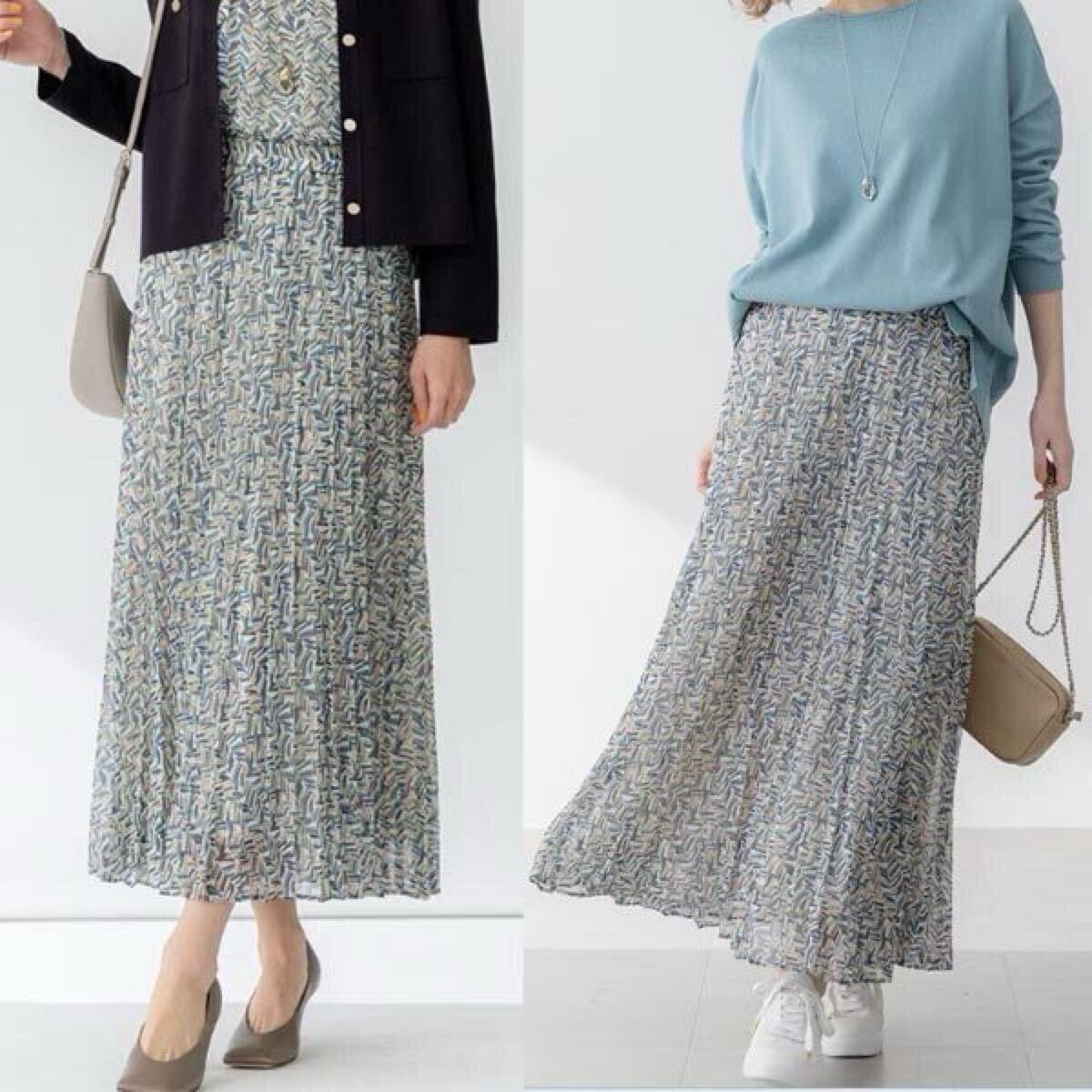 透け感のあるプリーツにグラフィカルなプリントで、華やぐプリントスカート