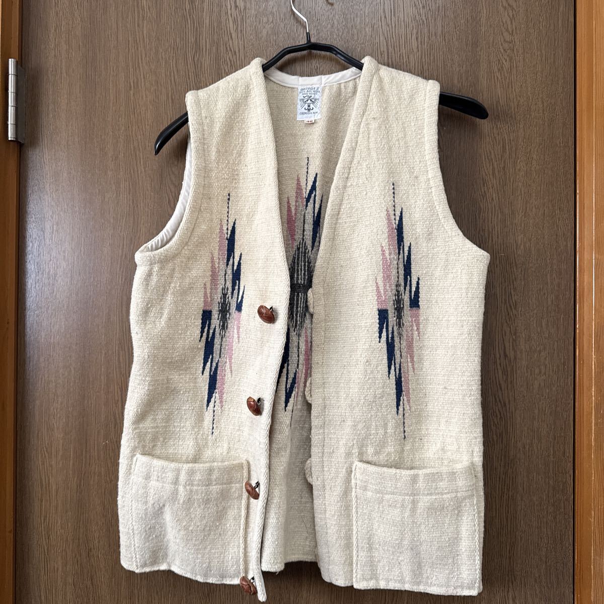 オルテガのチマヨベストです。全体的にアイボリーに、模様はネイビーとピンクとベージュです。使用感、毛羽立ち、色褪せ、シミなどは散見されます。