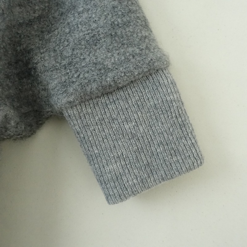 COGTHEBIGSMOKEのショートピーコートです。カラーはグレーで、ループニット生地で仕立てられており、裏地が付いております。ドルマンスリーブデザインで、ワイドなシルエットになっており、着丈はフロント側が少し短くなっております。フロントはダブルボタン仕様で、両腰にポケット付き、袖口はリブに切替られております。定価(メーカー希望小売価格)79,000円 税込みの商品です。