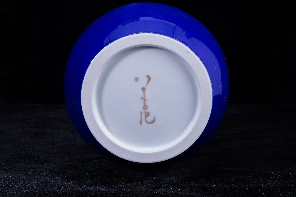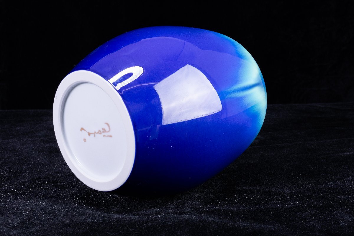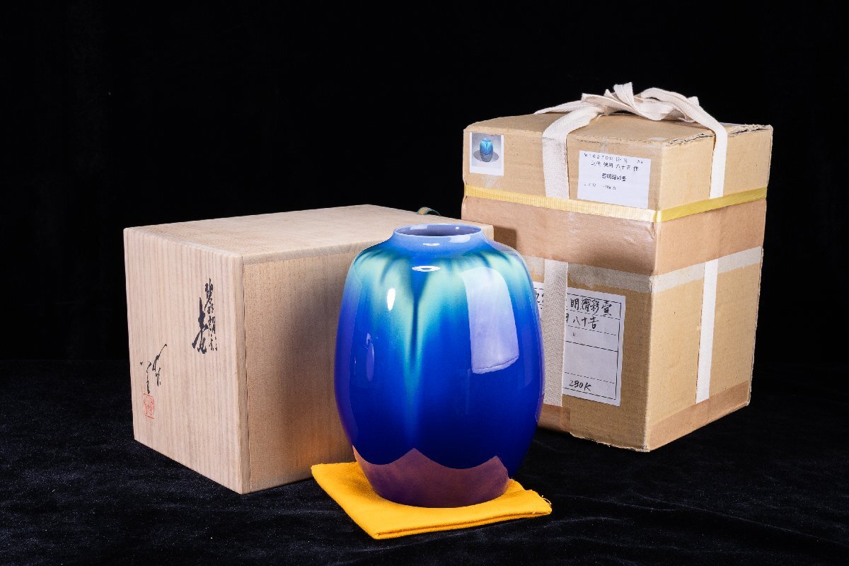 Product name: 【珍品堂】1円から M60-P20 九谷焼 人間国宝 三代 徳田八十吉 作 在銘 碧明耀彩 壺 高21cm 共箱 木箱 共布 飾壺 花器 置物 骨董品 時代物