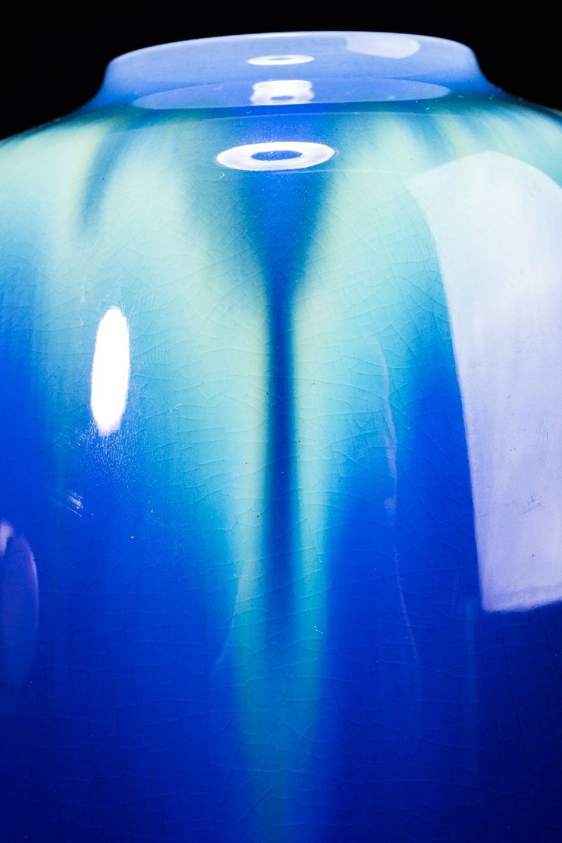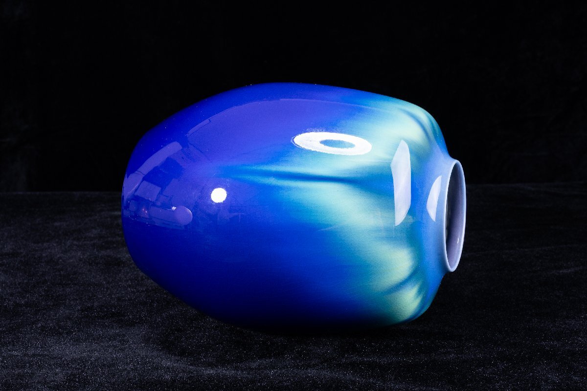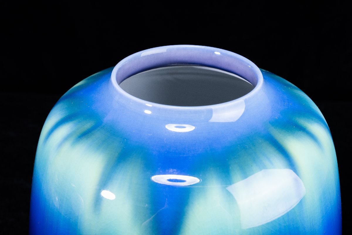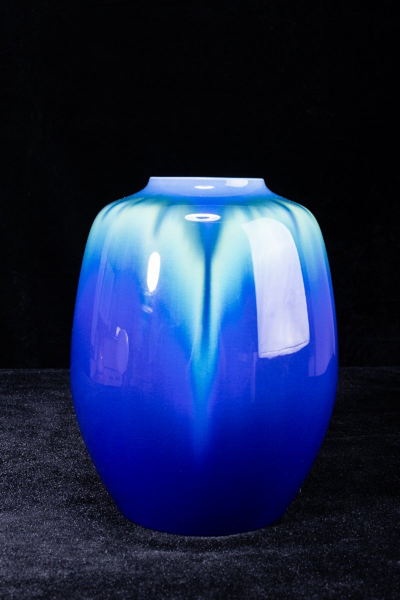 Product name: 【珍品堂】1円から M60-P20 九谷焼 人間国宝 三代 徳田八十吉 作 在銘 碧明耀彩 壺 高21cm 共箱 木箱 共布 飾壺 花器 置物 骨董品 時代物