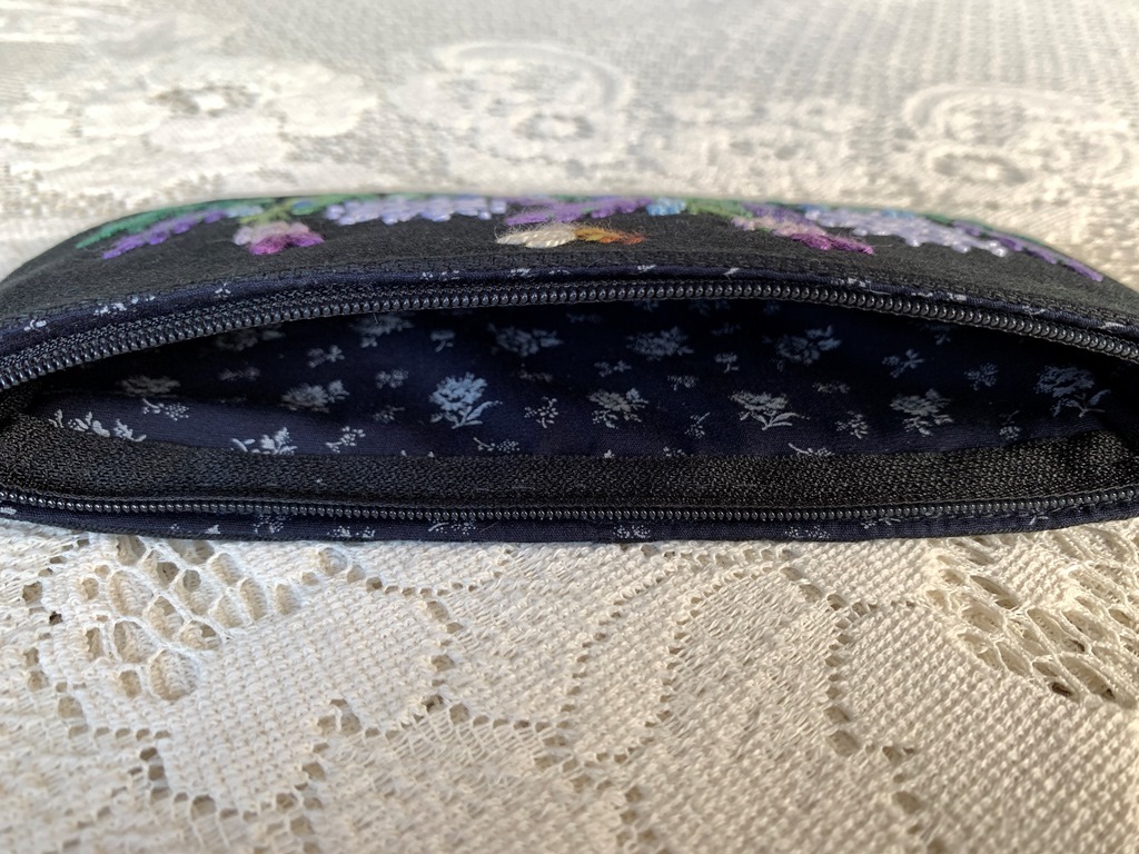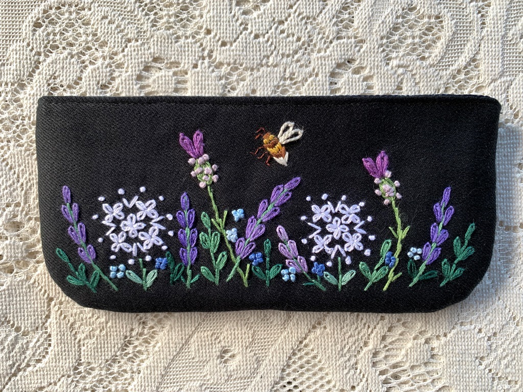 ハンドメイド 手刺繍 「蜜蜂とラベンダーガーデンのペン、グラスケース」 筆記用具 眼鏡 コスメ用品 黒色 2