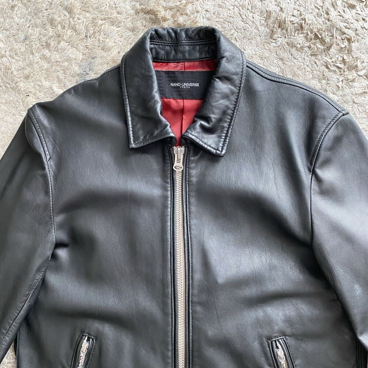 極美品●Lサイズ●nano universe ナノユニバース レザージャケット ライダース ブルゾン ラムレザー 羊革 裏地レッド 黒 ブラック 1円