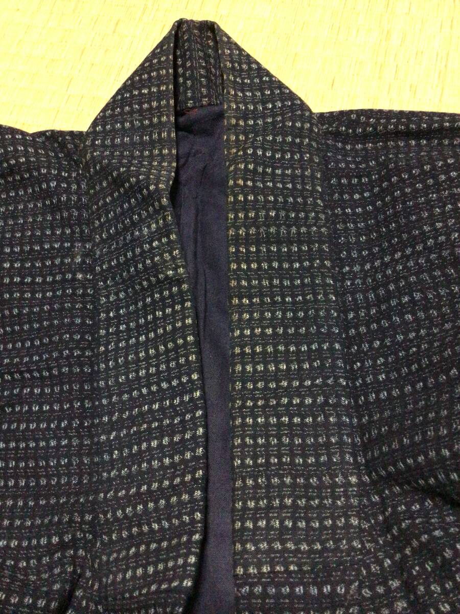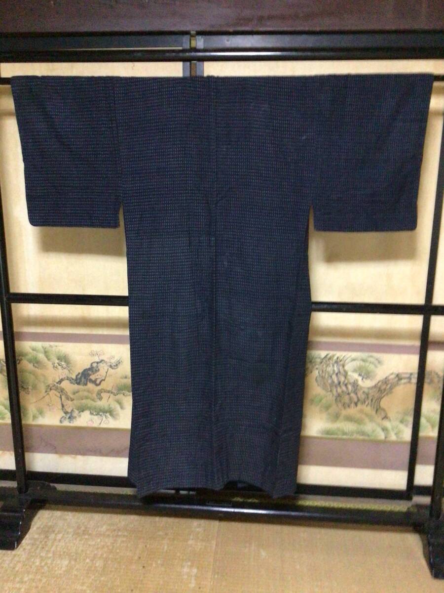 丈138、裄65、袖49センチあり、書生絣木綿です。傷みはありませんが、襟山によごれがあります。