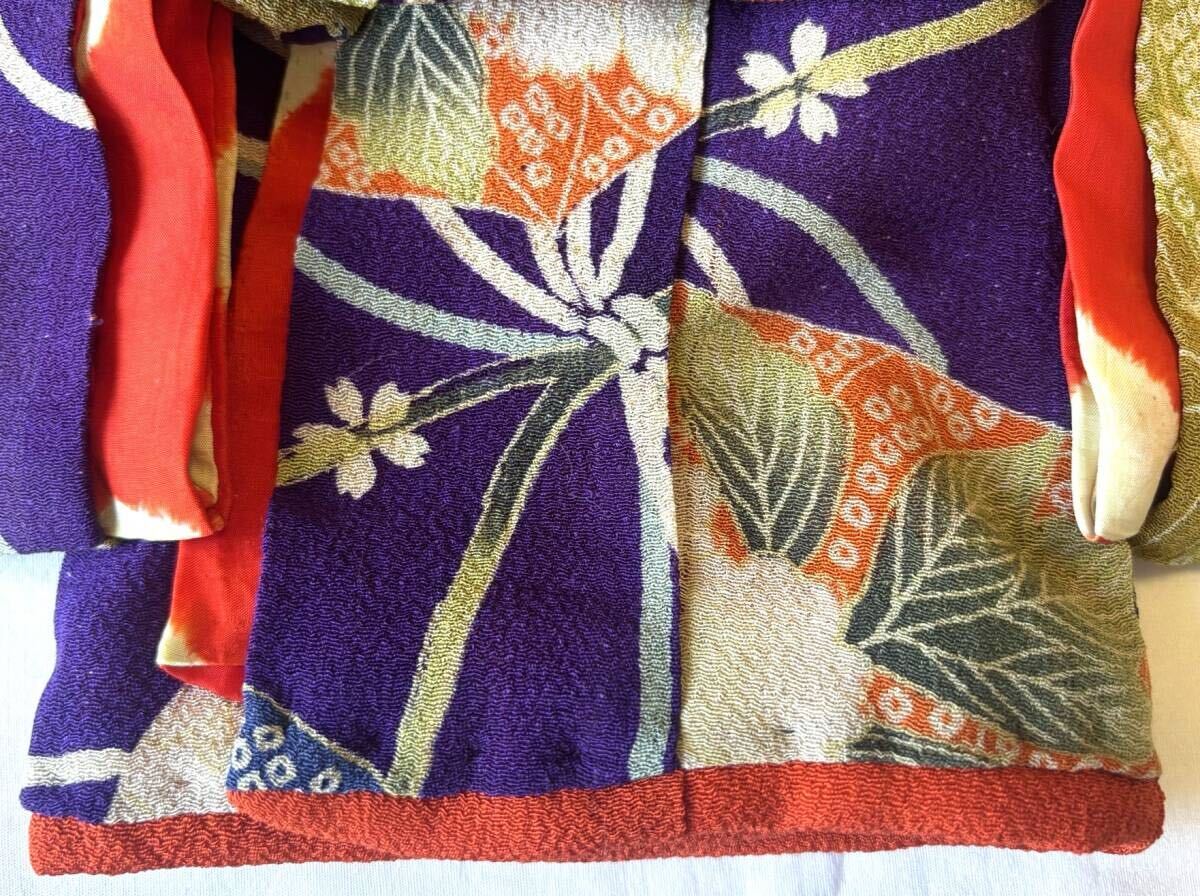 Product name: 人形の着物(10号相当)アンティーク絹縮緬 紫紺地、葵、菊、桜、大正ロマン 半襦袢/帯/帯揚げ/帯締め/縮緬の帯留め付き 送料無料