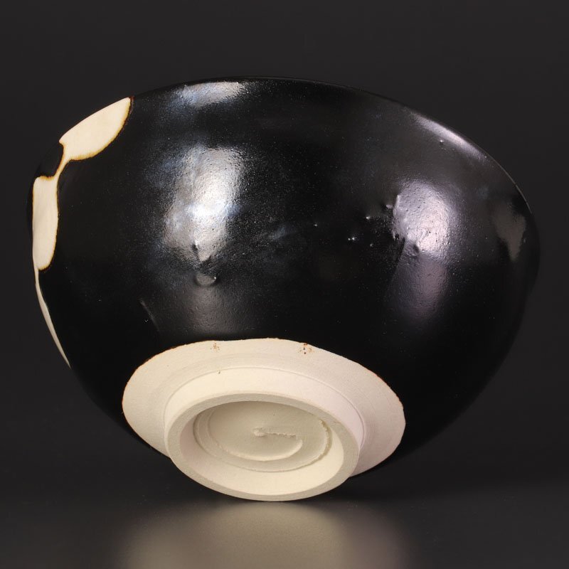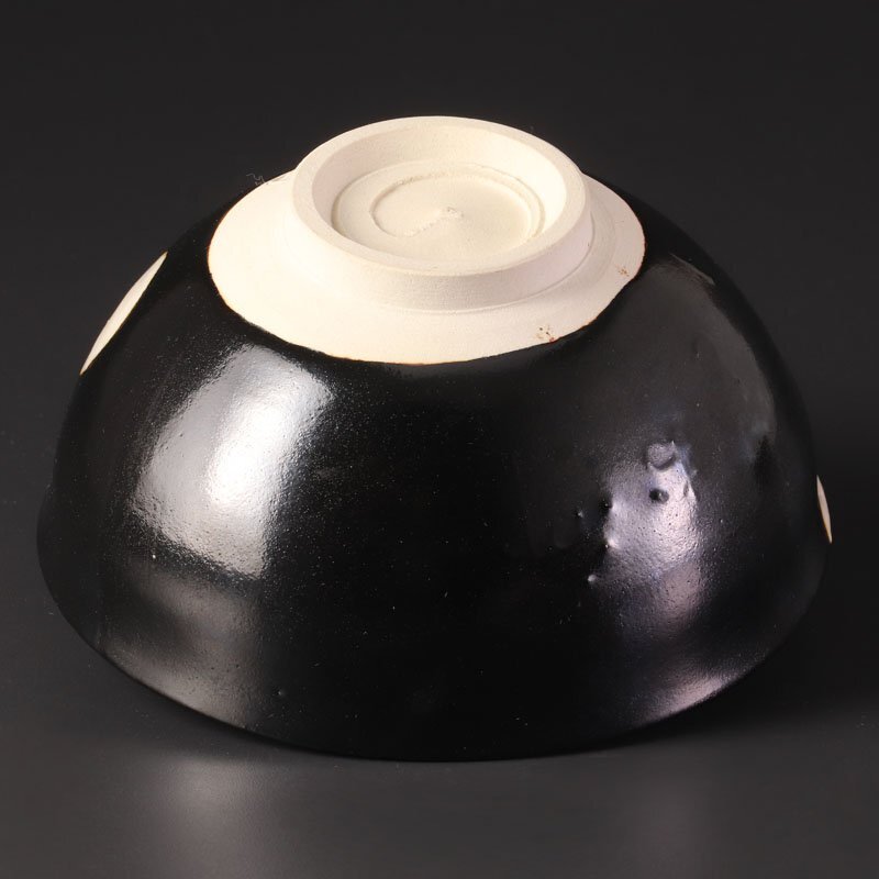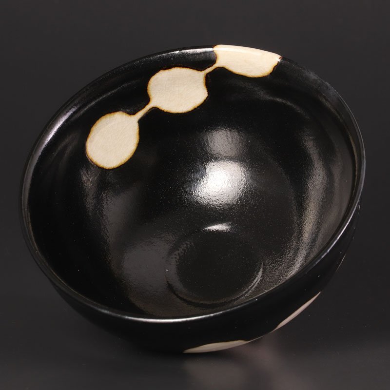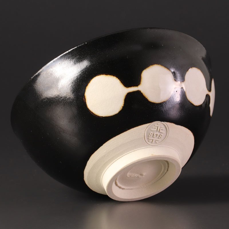 内側までつながっている白いお団子の絵付けが施された都おどり茶碗。よく目を凝らしますと、側面の黒い部分に「りどお都」の文字がうっすらと浮かんでいるのが分かります。