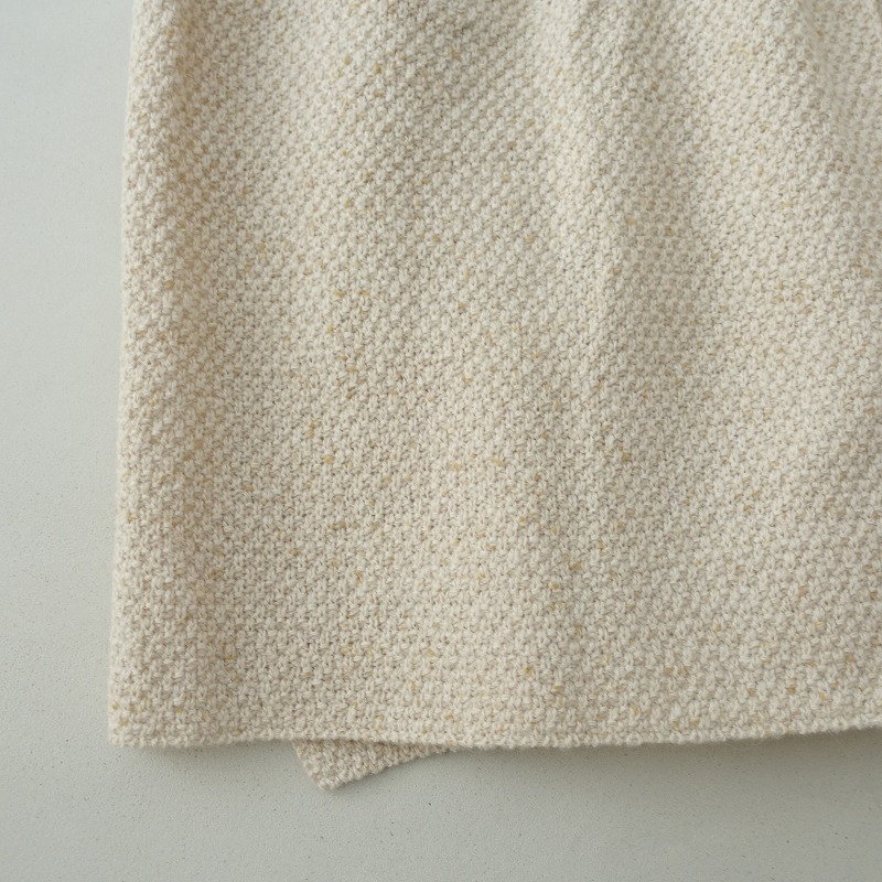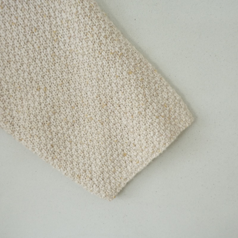 ICHIの鹿の子編みワイドニットロングカーディガンです。カラーはミックスライトベージュで、鹿の子編みが施されたニット地です。身幅広めのフロントオープンデザインで、前腰左右にポケットがございます。裾両サイドにスリット入りで、後ろ裾丈が少しだけ長めです。