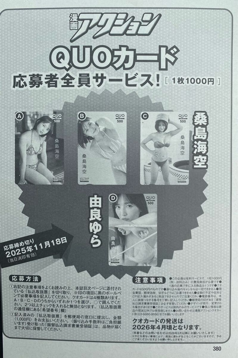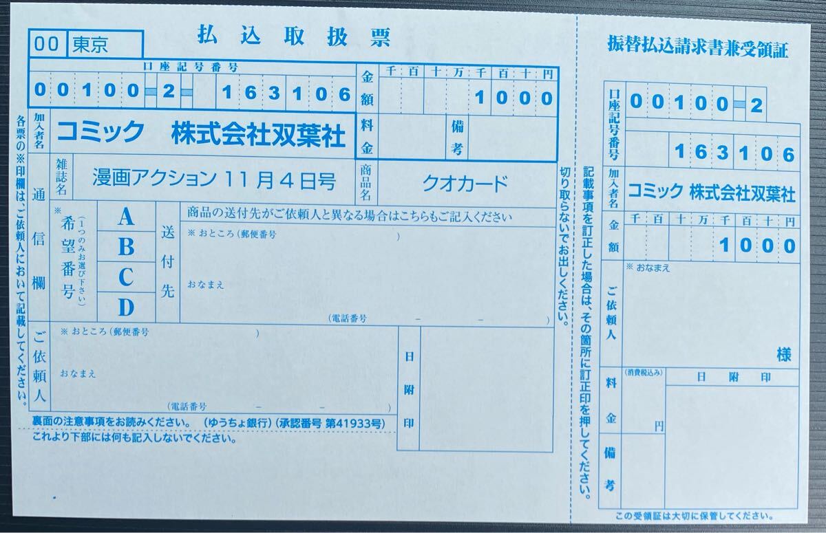 Product name: 漫画アクション11月4日号 (2025年21号)桑島海空 由良ゆら応募者全員サービス特製QUOカードプレゼント応募用紙(払込取扱票)