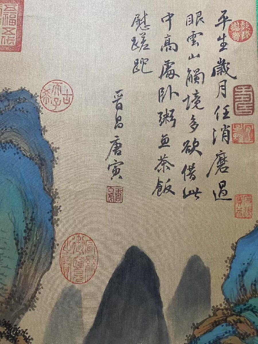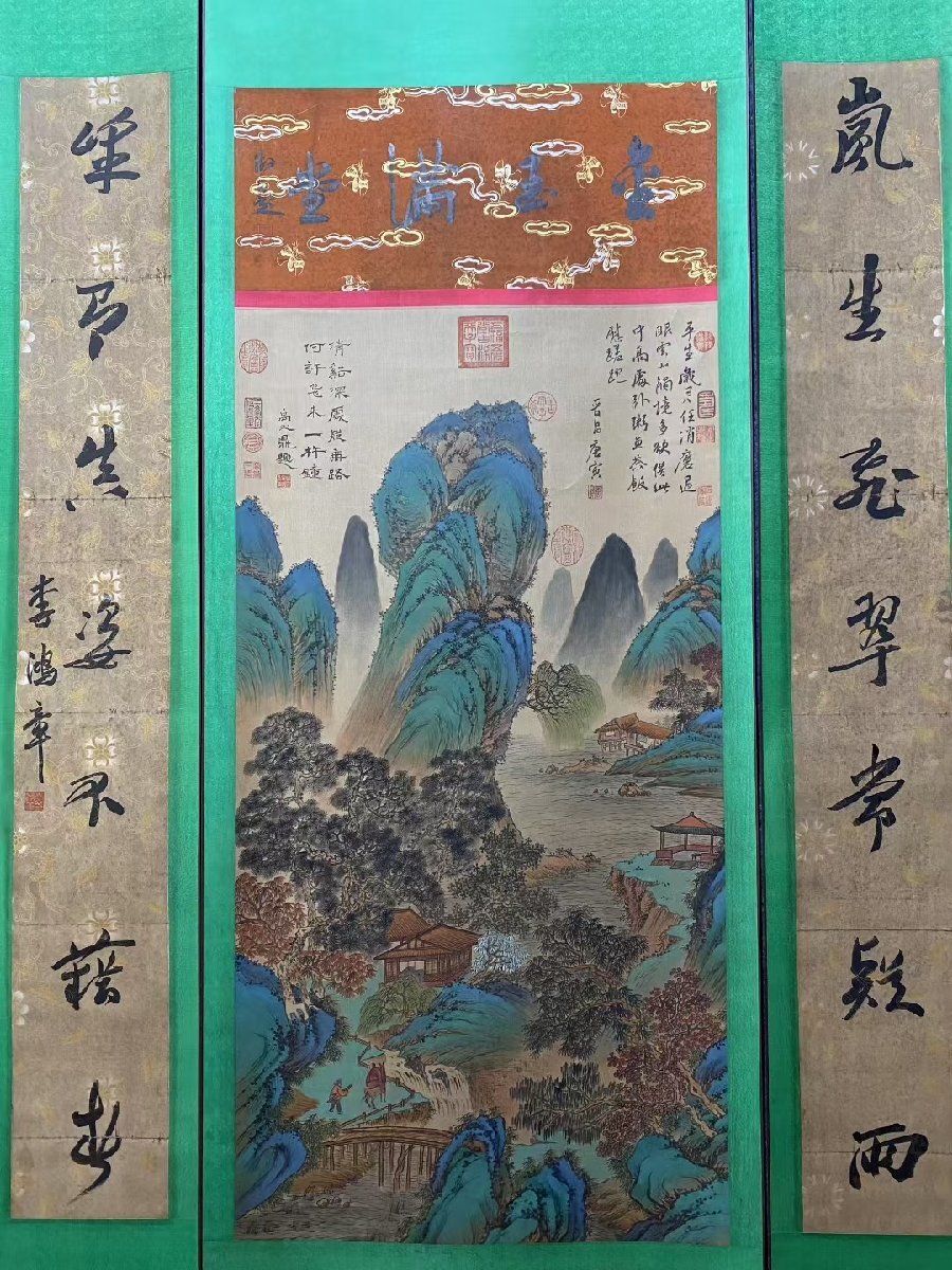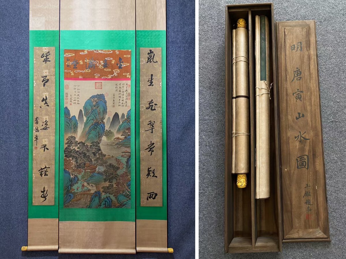 Product name: 【安】中国明時代画家「唐寅書」絹本「山水図 書法対聯」掛軸 共箱 中国画 墨寶妙品 中国書道 古美術 363