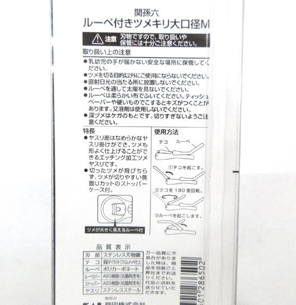 内 容 ■貝印 関孫六 ルーペ付きツメキリ 大口径 M(HC-3528)
