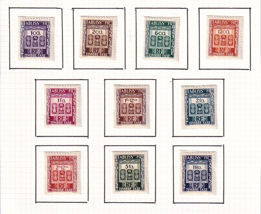 18 仏領インド【未使用】<「1948 SC#J19-J28 (不足料) メダリオン模様」 10種完 on リーフ切取り >