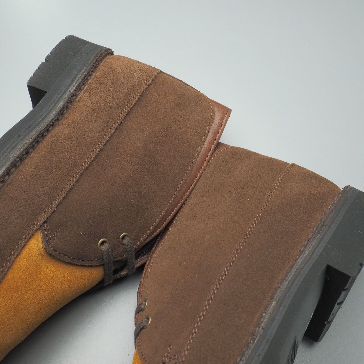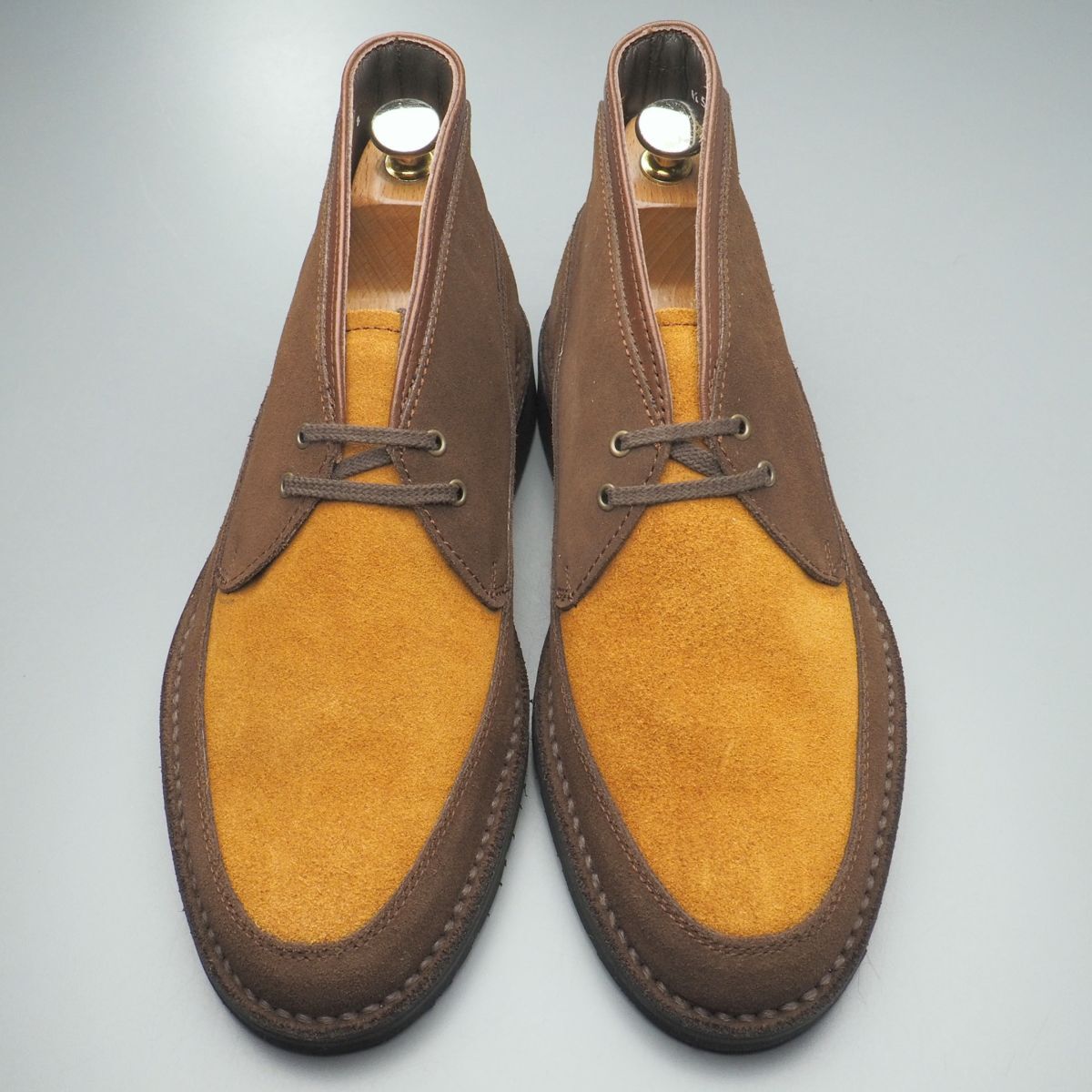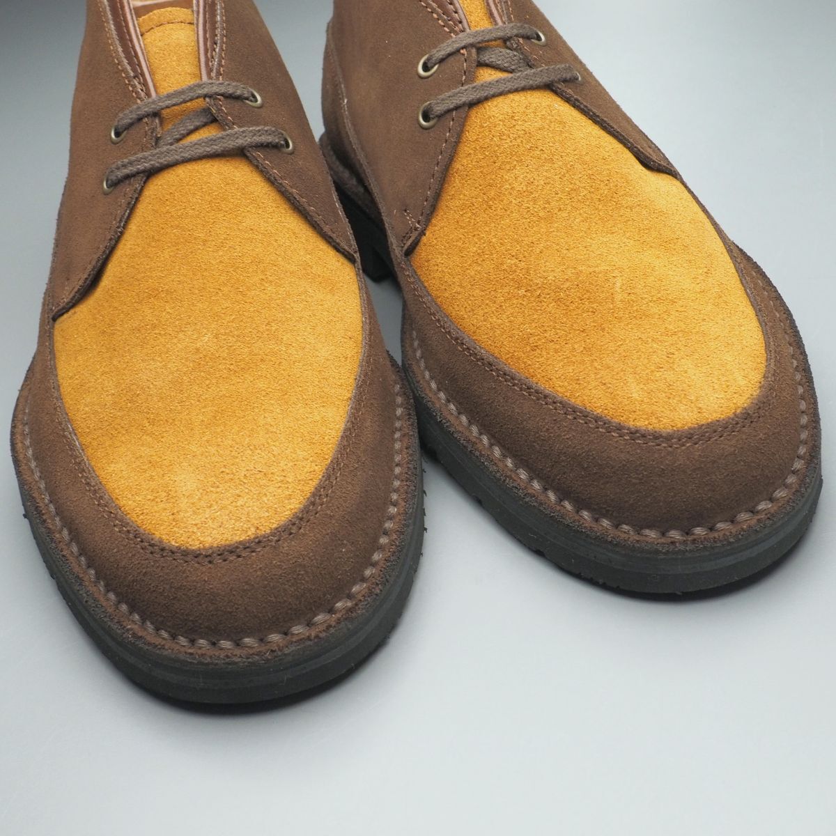 トーンの異なる2色の茶のスウェードレザーで形取られたモカシンフロントの2アイレットチャッカ。