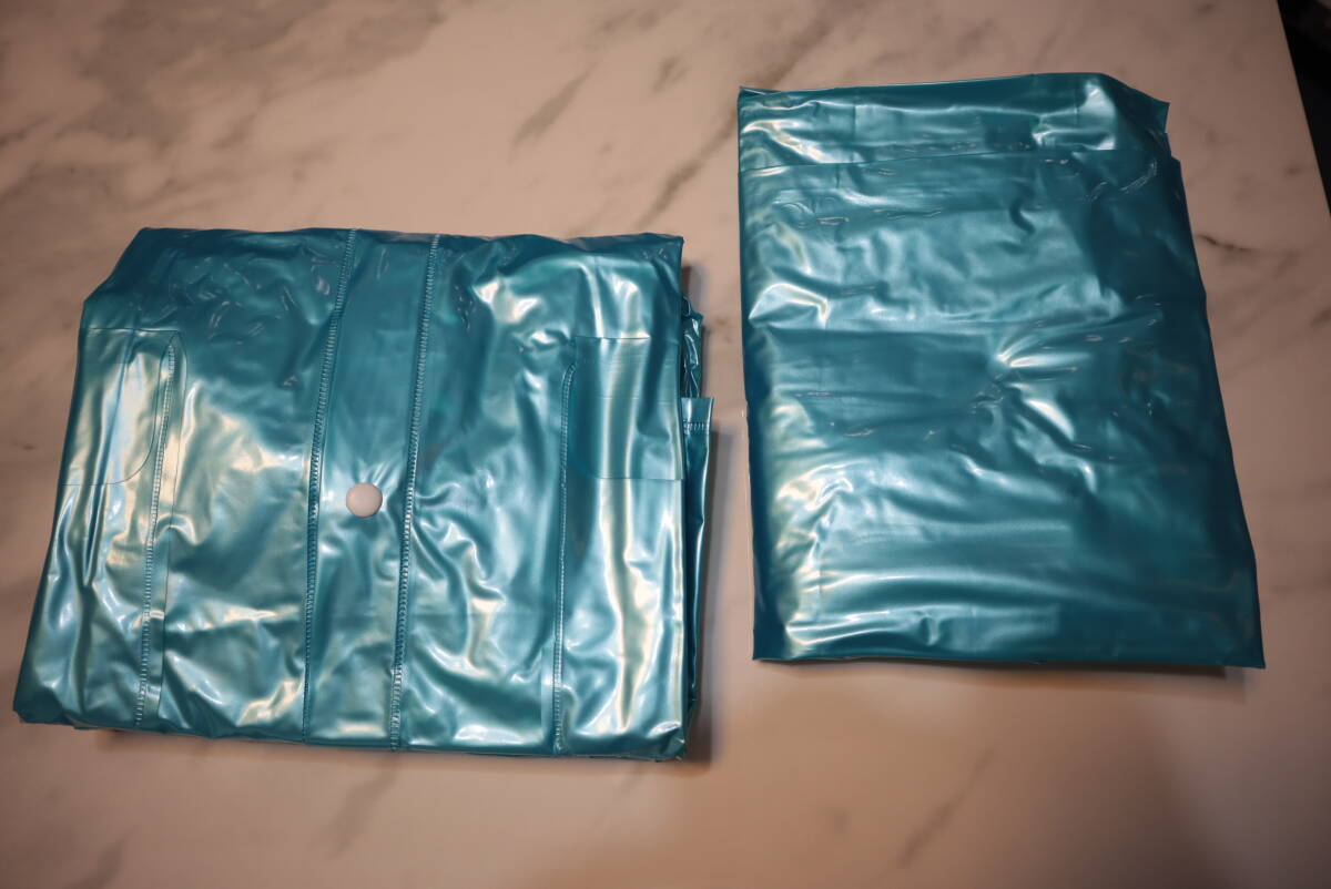 光沢のあるPVCビニール製、上下タイプで、サイズはフリーになります。色はエメラルドグリーンにブルーがかかったような感じで、セルリアンブルーが近いと思います。