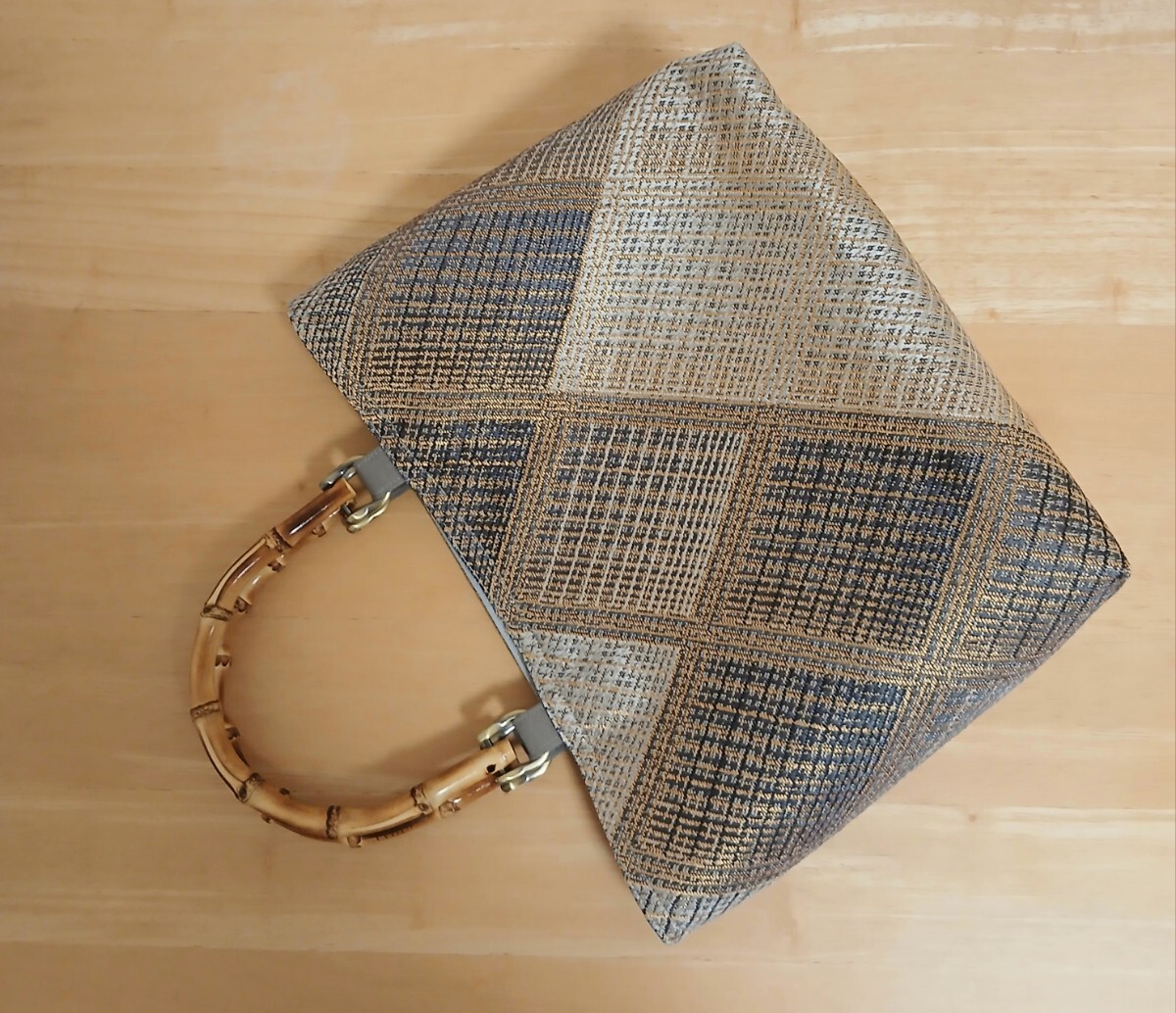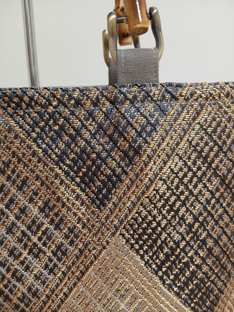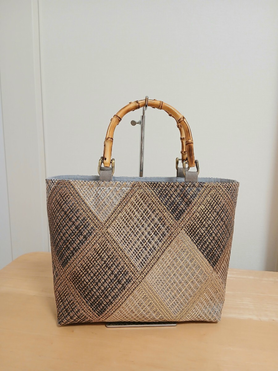 灰茶地の柿渋染め、金糸の斜格子柄がとてもきれいな伝統工芸 (寺田寛志) の素敵な正絹袋帯でトートバッグを作りました。