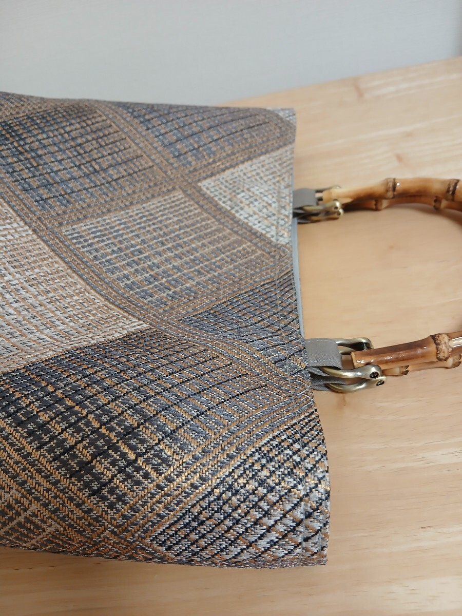 Product name: 帯リメイクバッグ★ハンドメイドトートバッグ★柿渋染め、伝統工芸 寺田寛志 斜格子 金糸 灰茶 正絹袋帯