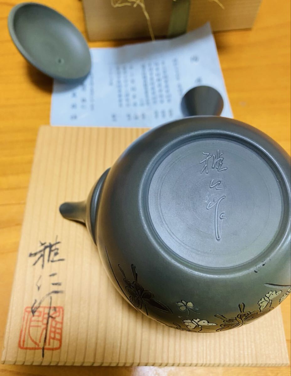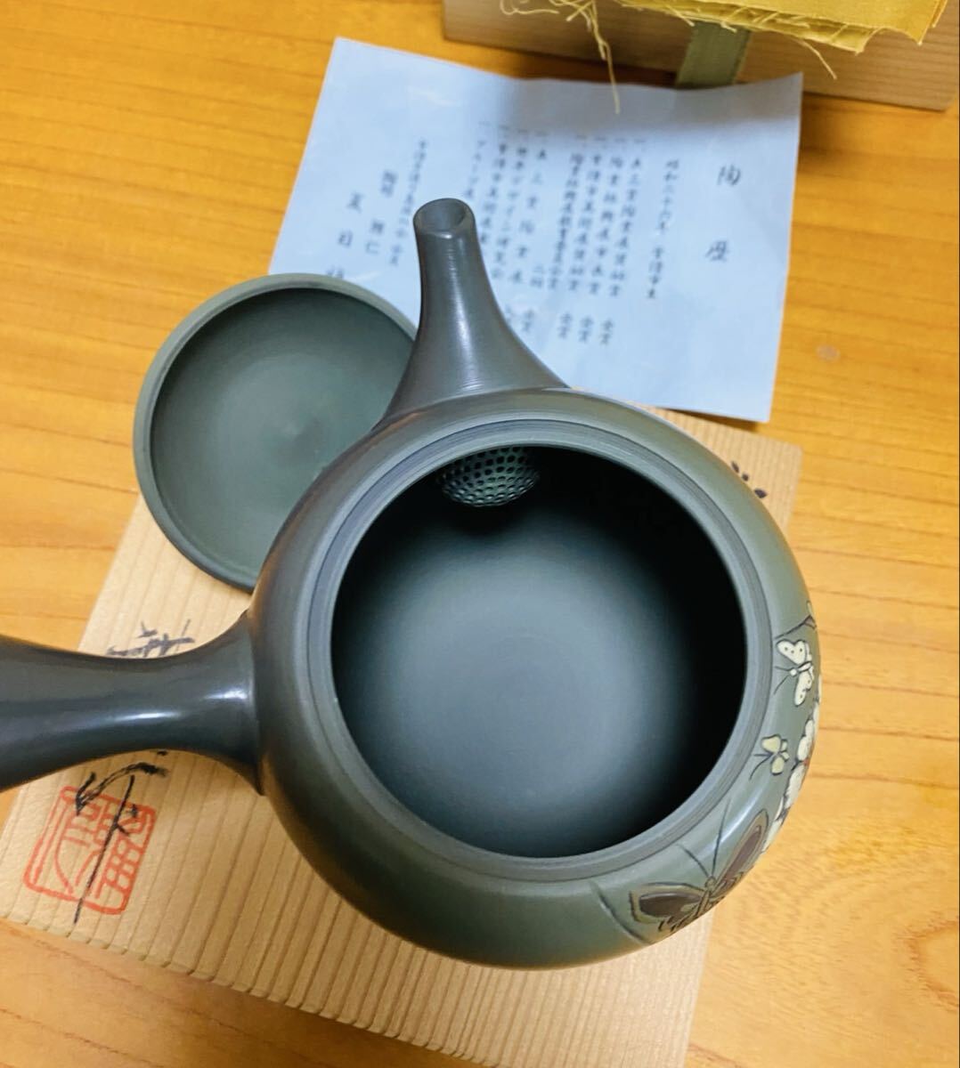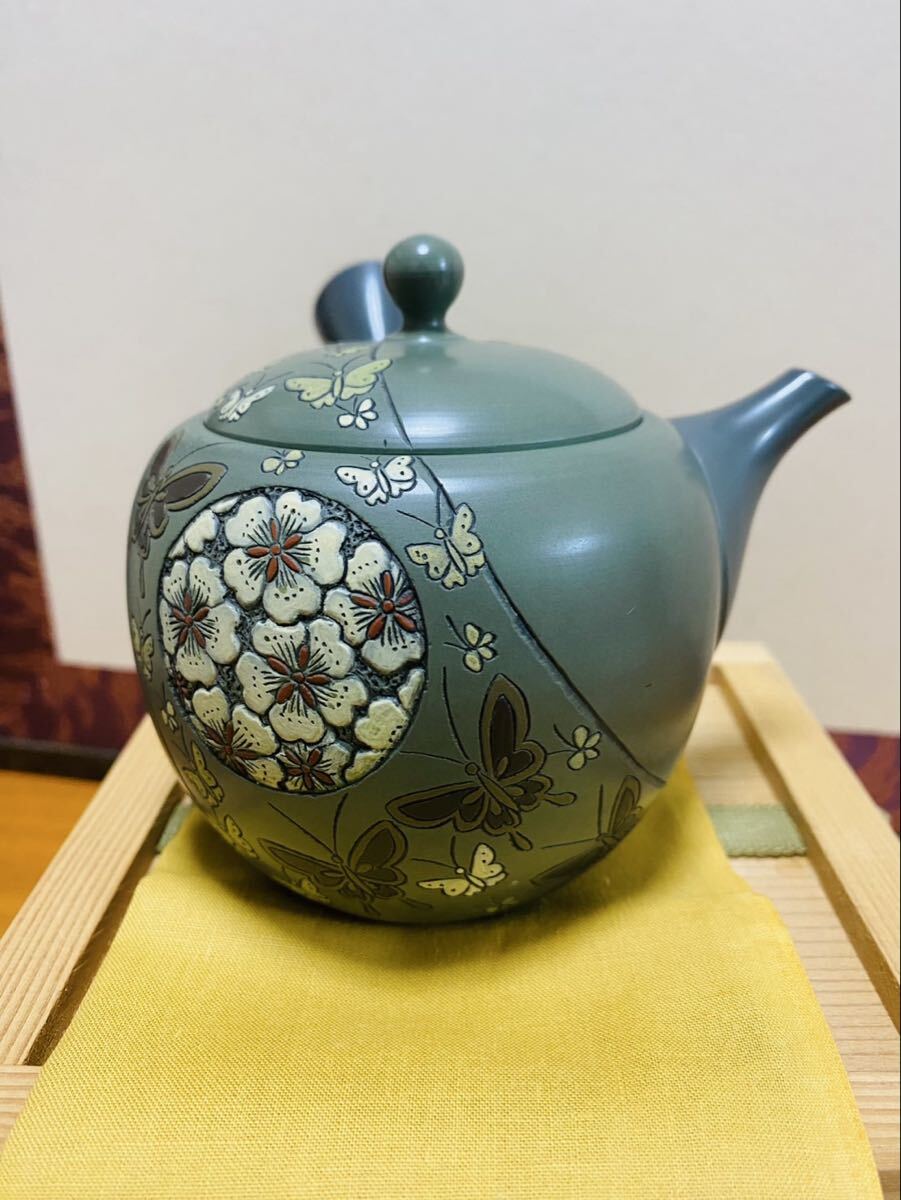 Product name: 常滑焼 夏目雅仁 急須 花蝶彫 茶注 煎茶器 緑泥 茶道具 木箱 共箱 銘品 桜 常滑名工