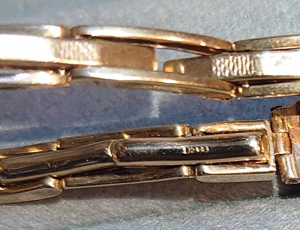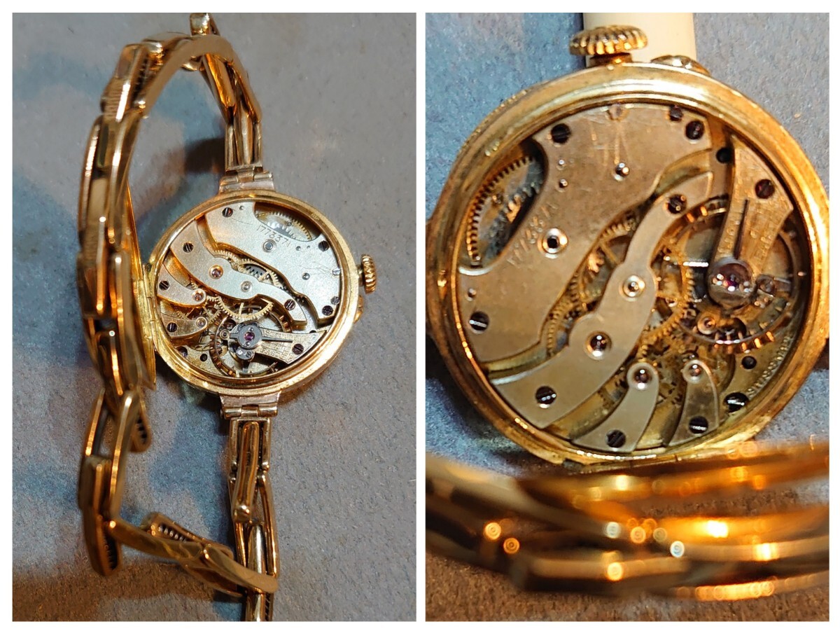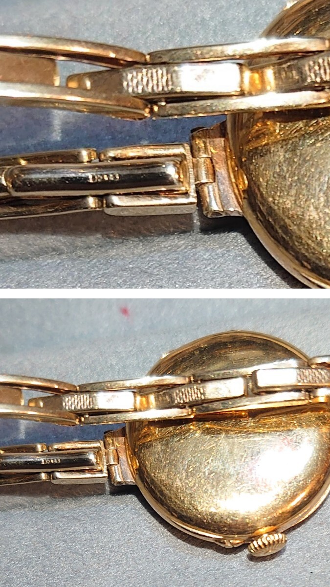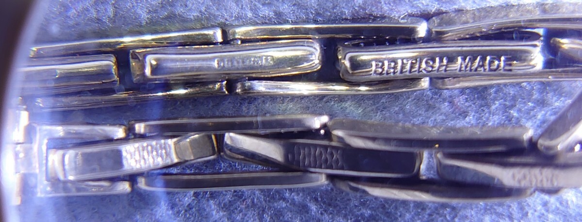 1920年頃のイギリスアスプレイの腕時計です。知人がイギリスで購入してずうっと使用しておりましたが誤ってリューズを巻き過ぎた為にゼンマイが切れてしまった物を譲り受けた物です。従いまして現在稼働しておりませんので修理を前提にご購入下さいますよう宜しくお願い致します。天芯は折れておりません。全体的に文字盤は綺麗な状態でシードパールに欠損もなく仲々良い状態です。時計の裏蓋に(0.755)(18C)と金質の刻印があり、裏蓋と機械にそれぞれ(1773371)と同じ刻印があります。機械の内側に(SWISS MADE)と刻印があります。時計のバンドは10コマありしっかりとしておりバネも切れておりません。画像のように(BRITISH MADE)と刻印があり、ちょっと判別し難いですが(9・375)と数カ所9金の刻印があります。