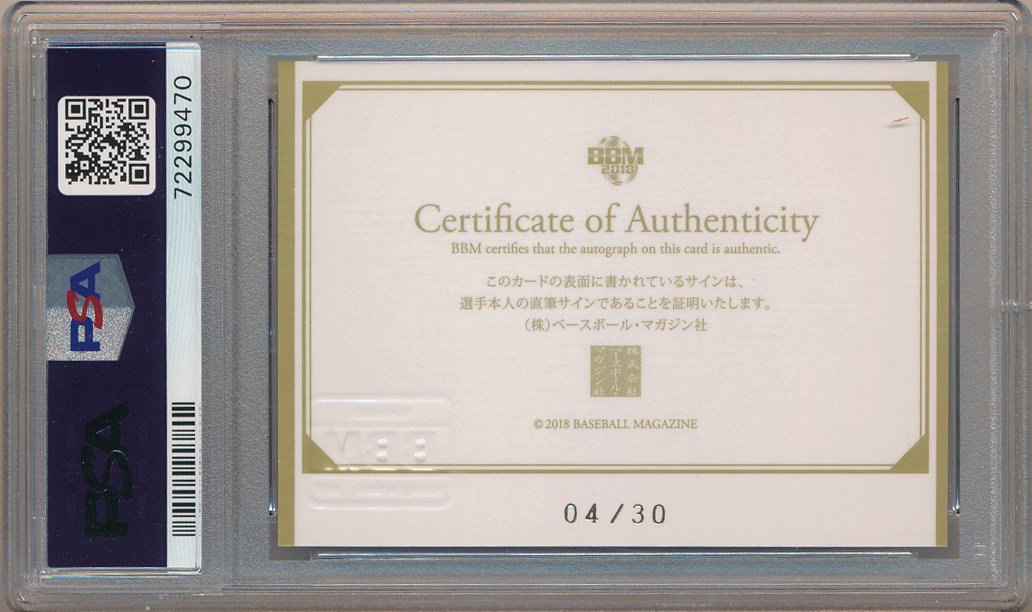 Product name: 村上宗隆 2018 BBM 1st Version クロス 直筆サイン Cross Signing Autograph #PSA 10 Gem Mint 完璧 #RC ルーキー Munetaka Murakami