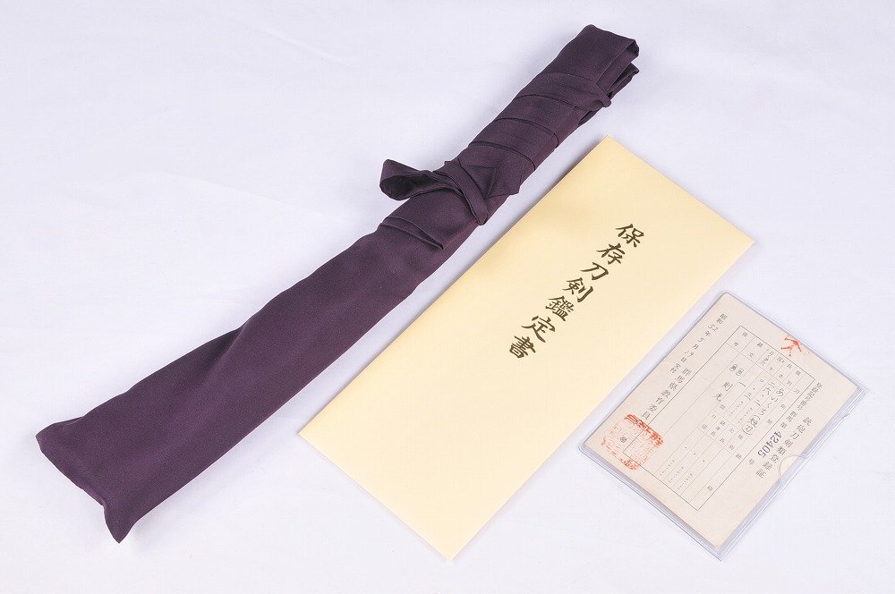 日本刀は美術品です。本品は正規の『銃砲刀剣類登録証』が発行されている作品で、『銃砲刀剣類登録証』が発行された日本刀は美術品として扱われ、どなたでも御買い求め頂けますし、コレクションする事が出来ます。本品を落札された方は銃砲刀剣類所持等取締法に基づき、発行都道府県の教育委員会に所有者変更の届出が必要となりますが、この名義変更は葉書にて通知するだけで、所持に際し煩わしい手続きや新規の許可申請等は必要有りません。名義変更に必要な葉書は当方にて作成し、発送の際に同封致しますのでご安心下さい。