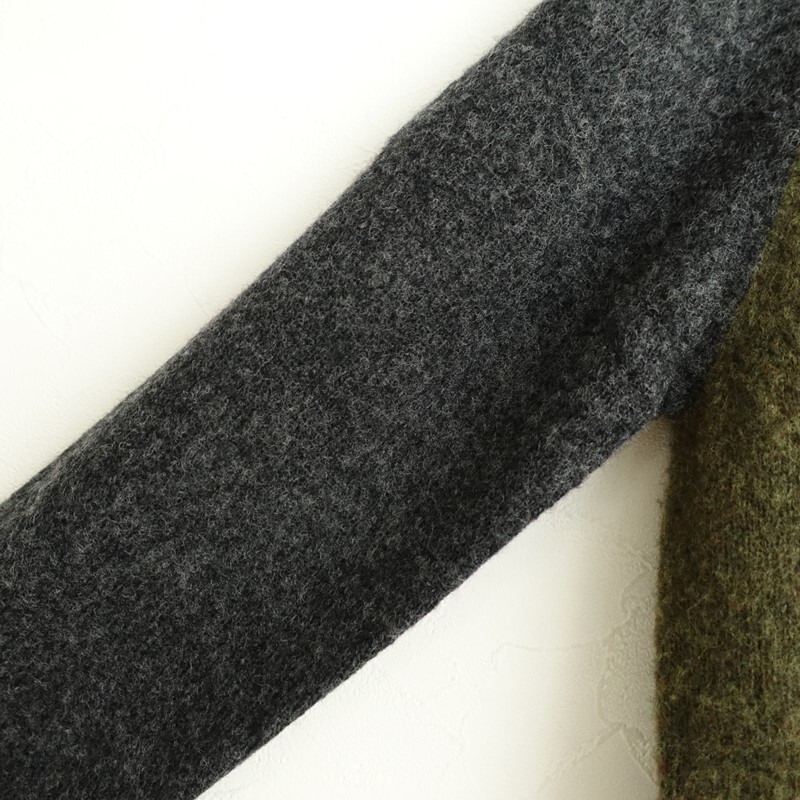 R&D.M.Co-のクレイジーシャギーニットです。カラーはグリーンカーキ・チャコール・ダークブラウン・グレーブラウン・グリーンの切り替えで、毛羽感のあるウールニット地です。プルオーバータイプで着脱でき、ネック・袖口・裾はリブ編みです。