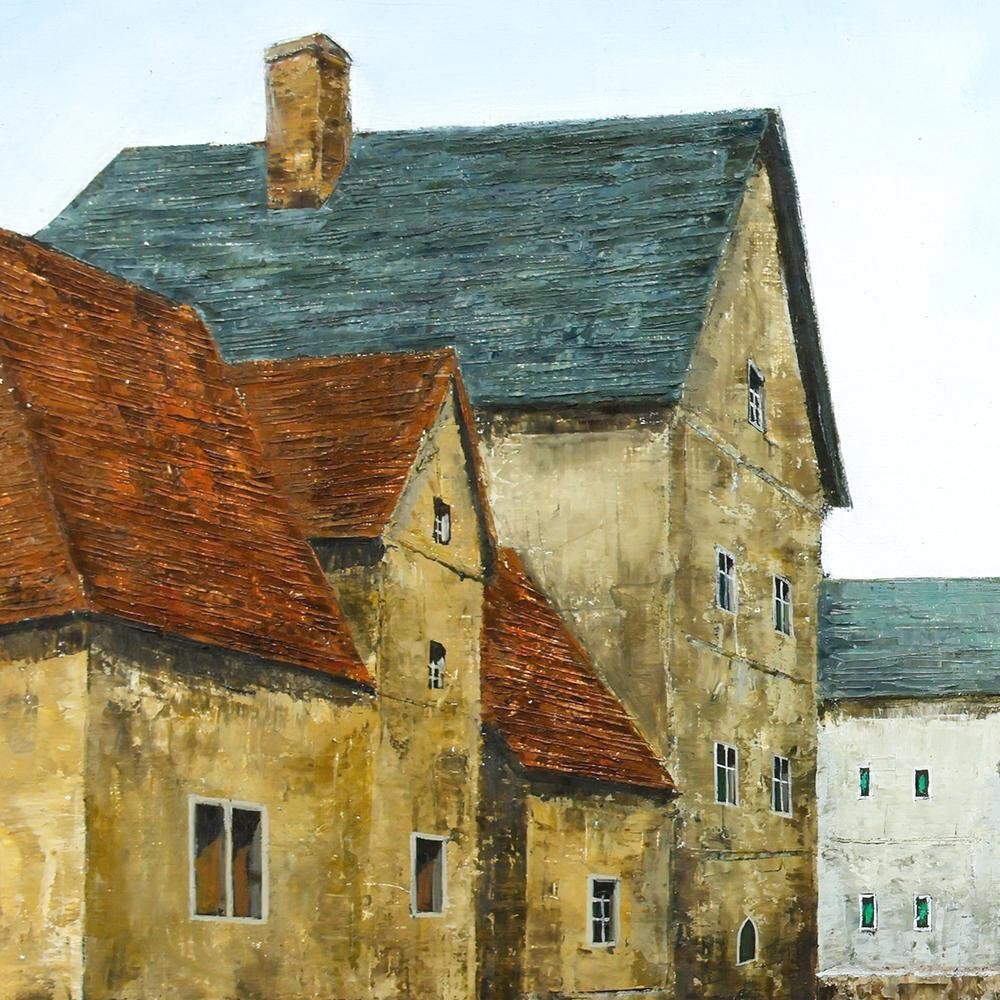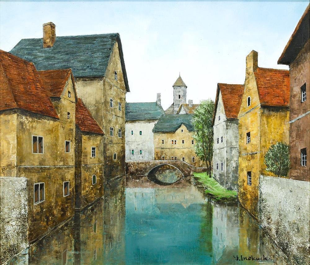 井口由多可(いぐち・ゆたか)は1947年福岡県福岡市生まれ。慶應義塾大学法学部を卒業後、1977年に第6回現代洋画精鋭選抜展で金賞を受賞し、フランスのル・サロン(仏芸術家協会)では名誉賞を受賞、永久会員に推挙された。現在は旭美術協会会長を務め、美術指導や福祉施設でのワークショップを通じ地域文化の振興にも貢献している。作風は、フランス、ドイツ、イタリアなどヨーロッパ諸国を中心とした美しい街並みを題材に、水・緑・空など自然と調和する風景を描くのが特徴で、世界各地への取材旅行を重ねながら制作を続けている。