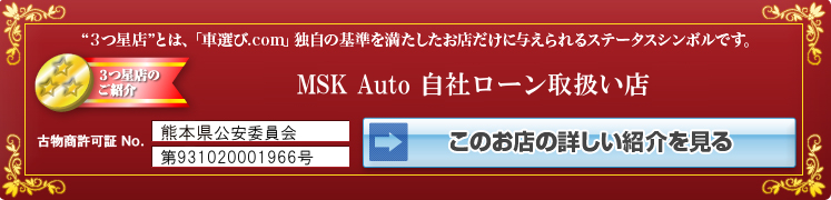 熊本市南区銭塘町にあるMSKAutoでは、充実したカーライフを過ごしていただけるようお車に関する様々なご相談をお受けしております。自社ローン完備しており他社で断られたなど申請に対してご心配な方でもお気軽にご相談ください。仮審査だけでも結構です!場所が分からないなどはもちろんのこと少人数で運営しているため、不在の場合もございます。ご来店の際には一度ご連絡をいただけると幸いです。