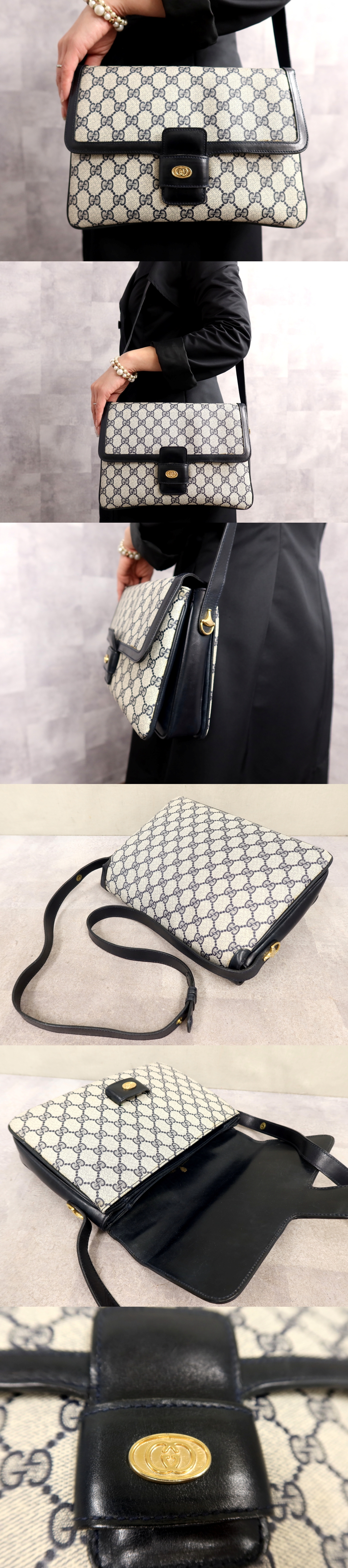 Store ●超美品●GUCCI グッチ●GGスプリーム●PVC カーフ レザー●ショルダー バッグ●ネイビー 白●G金具●イタリア製●ヴィンテージ●Js66134