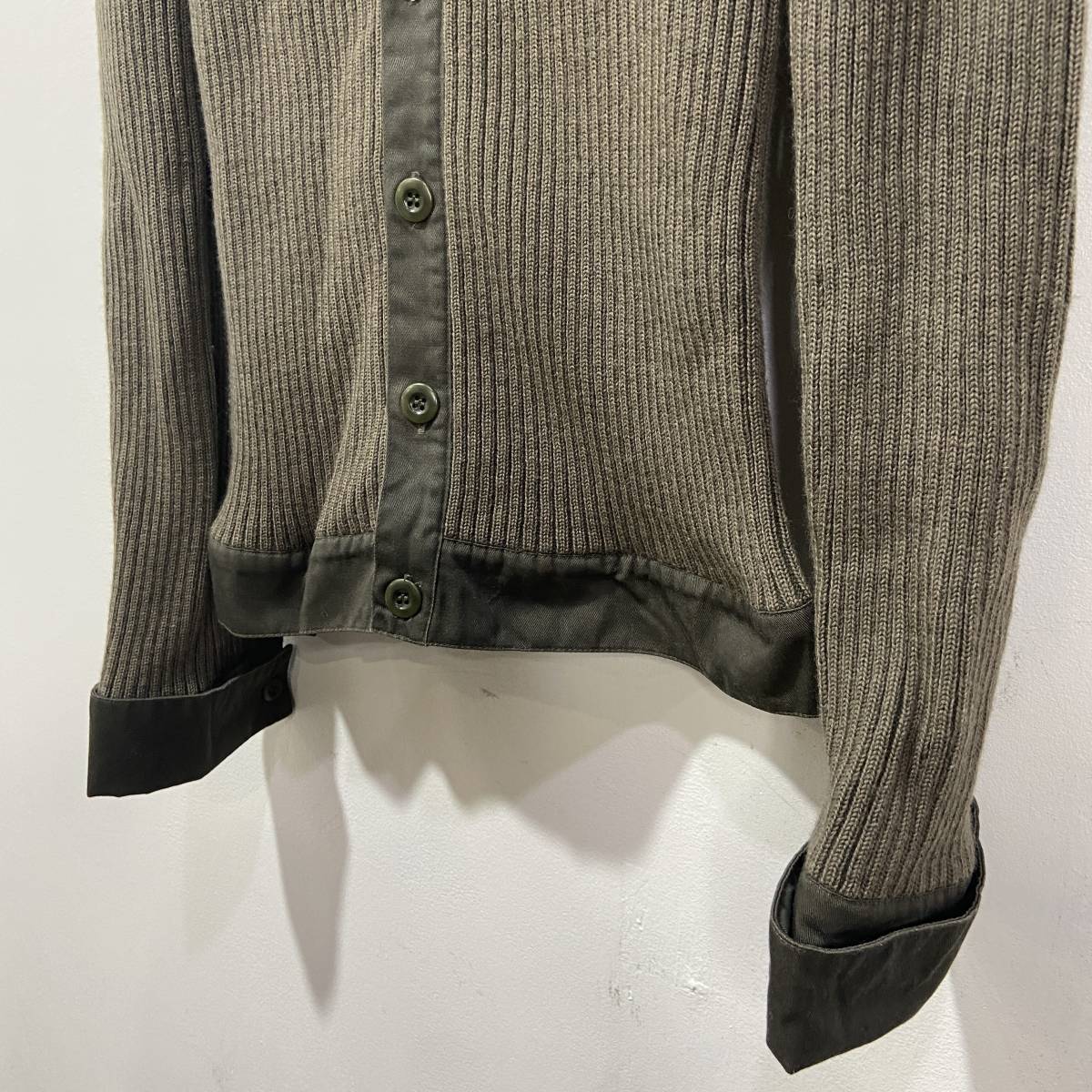 キャサリンハムネットのリブニットシャツジャケットになります。ミリタリーテイストのあるカーキカラーとボタンの雰囲気が非常にモードなデザインです。ドレスシャツのようなダブルに折り返された袖口との対比がおもしろい1着です。