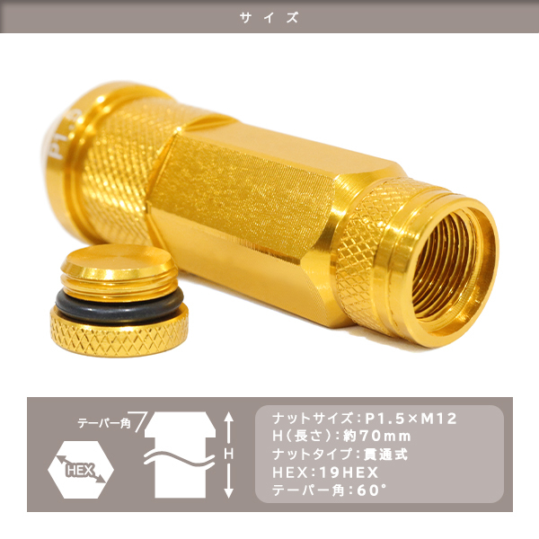 【 アルミホイールナット M12×P1.5 19HEX 70mm 貫通Dタイプ 1個 ゴールド 】