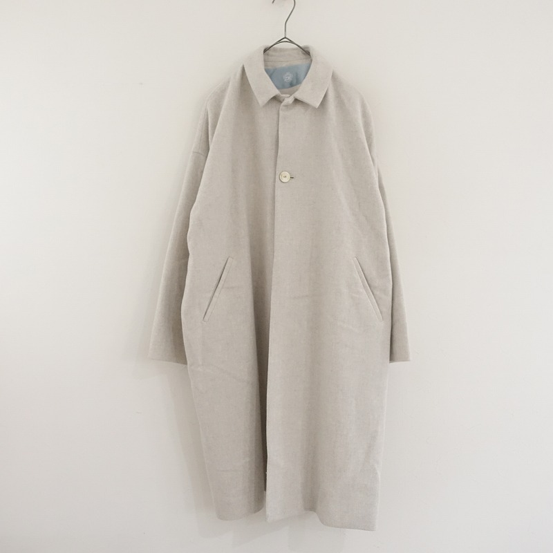 Dulcamaraのラムビーバーbigコートです。カラーはライトグレージュで、微起毛地で仕立てられており、裏地が付いております。フロントボタンは比翼仕様と交互になったデザインで、両腰にポケット付き、バック左裾に小さなポケットがあしらわれております。