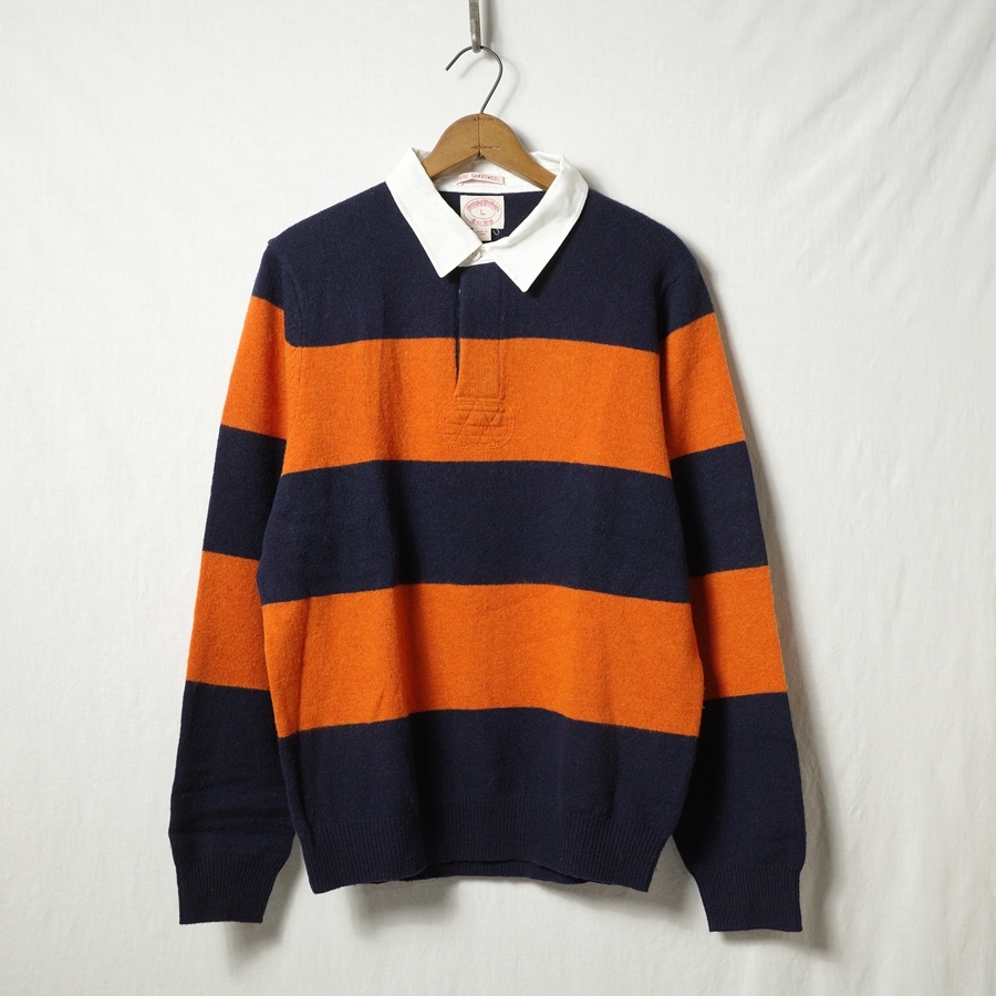 ブルックスブラザーズのニットラガーシャツになります。カラーはオレンジとネイビーのボーダーです。セーターにラガーシャツの襟を付けたデザインであまり見かけない珍しいモデルです。