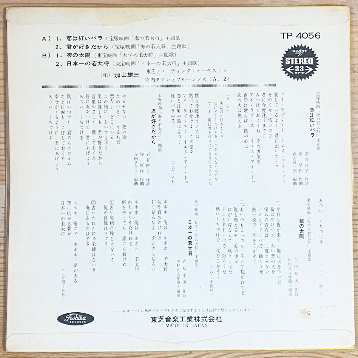 Product name: 7inchレコード/EP/和モノ/加山雄三/日本一の若大将/東芝赤盤/恋は紅いバラ/夜の太陽/海の若大将/大学の若大将/小西康陽さんプレイ!