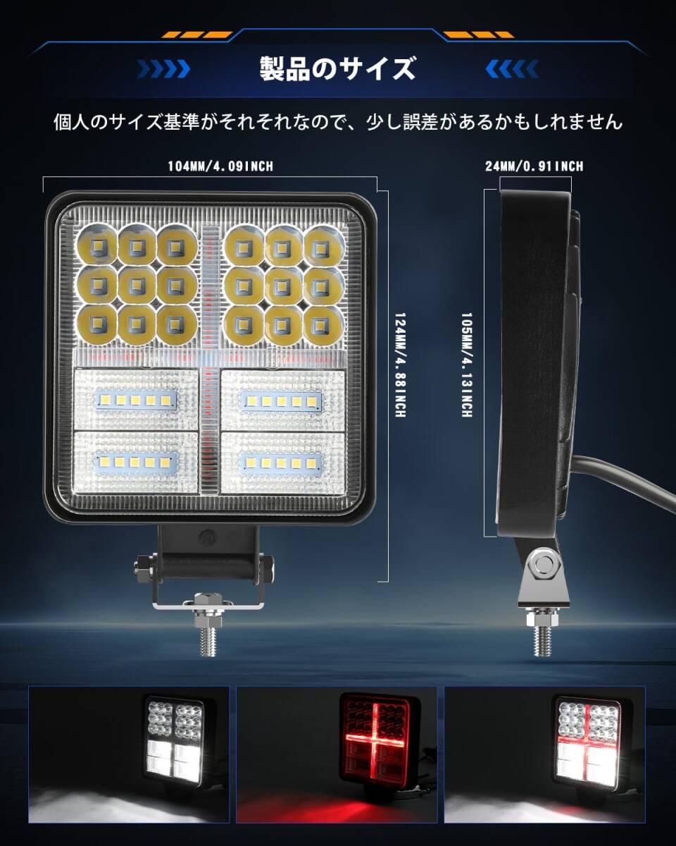 【製品仕様】LED作業灯:超高効率LEDが眩しい明るさを実現!このLED作業灯は白色光と赤色光の警告機能があり、「高輝度」「全方向拡散」「低消費電力」「長寿命」という特徴を持っています。動作電圧:12-24v(DC)