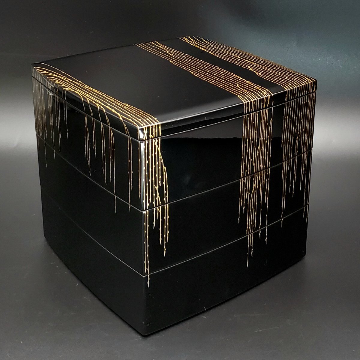 Product name: 【宝蔵】輪島塗 大雅堂 黒塗内朱 しだれ柳 糸柳 蒔絵 胴張 三段重 重箱 御重 約20㎝×約20㎝ 天然木 漆塗り 漆芸 化粧箱