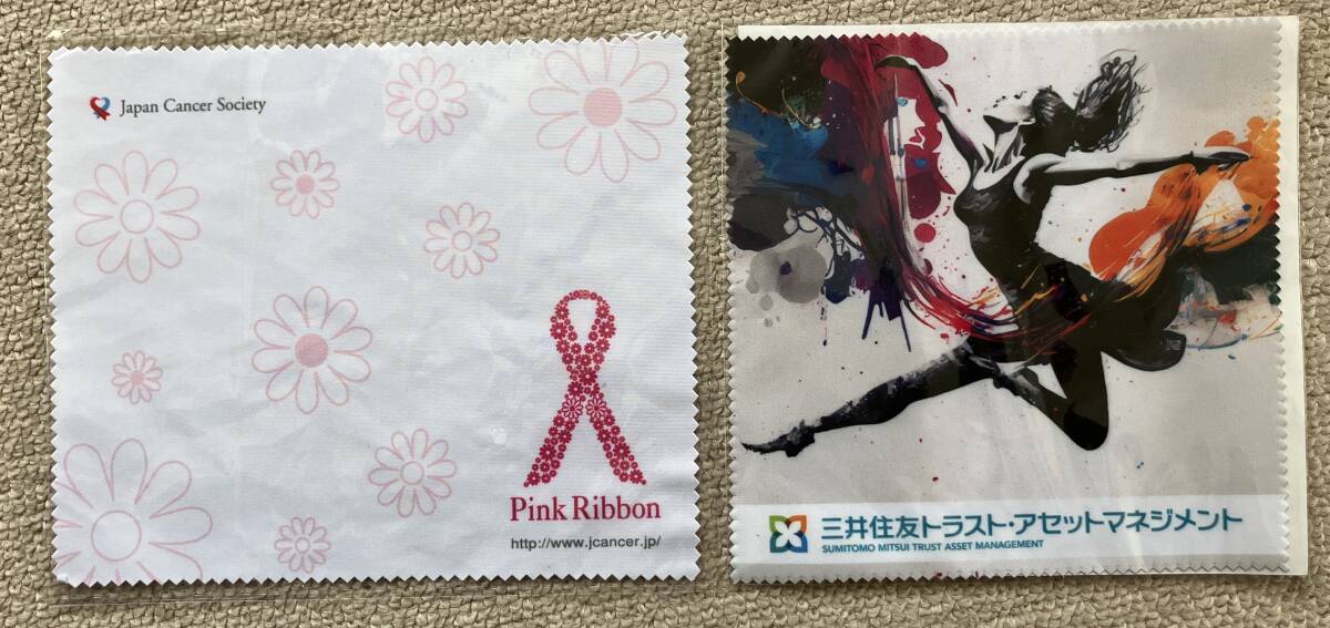 マイクロファイバークロス 2枚セットです。タブレット、スマホ、眼鏡レンズ、CD、貴金属などのお手入れに使用できます。日本対がん協会製Pink Ribbon18センチx15センチ、三井住友トラスト製は15センチx15センチです。新品・未使用・未開封です。包装袋のまま軽く二つ折りにして発送致します。
