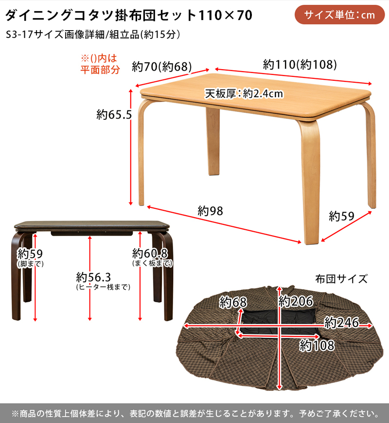 ダイニングこたつテーブル 110×70cm 掛布団付き2点セット ハイタイプ 高さ65.5cm ナチュラル S3-17(NA)