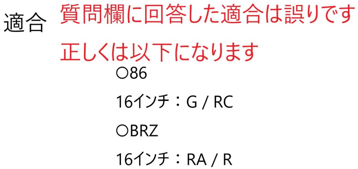 ※適合について 【質問欄での回答を訂正いたします】 適合は以下になります ○86 16インチ:G / RC ○BRZ 16インチ:RA / R