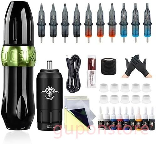 Product name: プロのタトゥーマシン ワイヤレスタトゥーマシンセットカートリッジニードル10本 タトゥー用品のフルセット付き (Color : グリーン)
