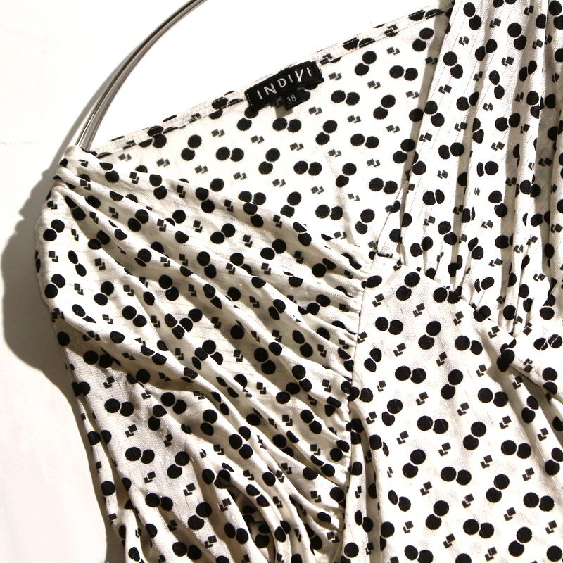 Product name: 美品 インディヴィ INDIVI 株) ワールド 春 夏 艶 ストレッチ ジャージ― 幾何学柄 プリント ギャザー タイト カットソー 9号 38 ホワイト