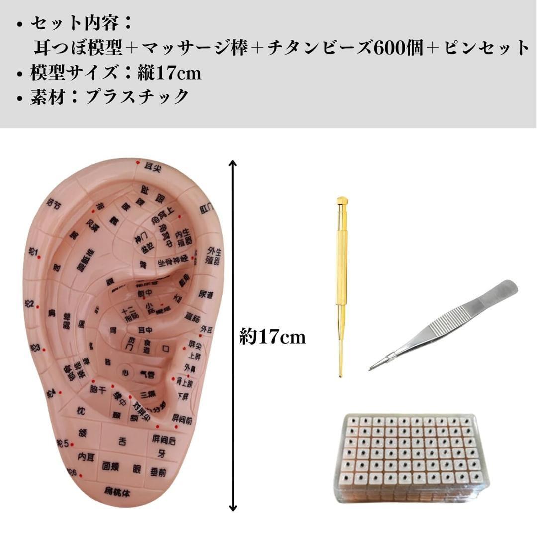 ●セット内容:耳つぼ模型・マッサージ用銅棒・チタンビーズ600個・ピンセット ●模型サイズ:縦17cm ●素材プラスティック