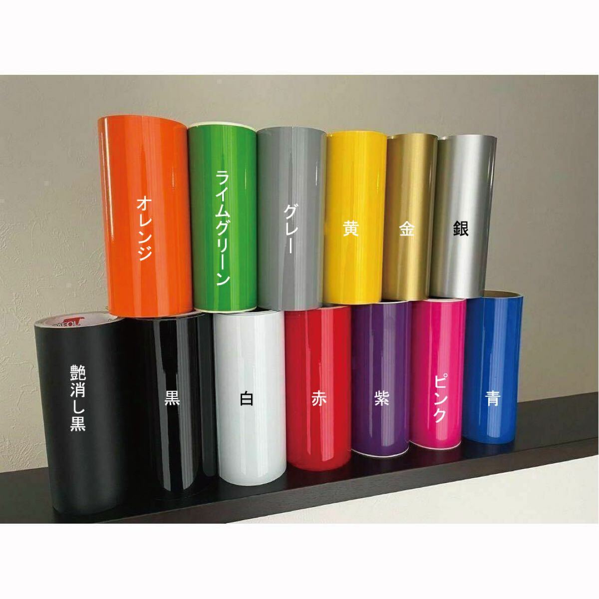 (艶消し黒、黒、白、赤、紫、ピンク、青、オレンジ、ライムグリーン、グレー、黄、金、銀)