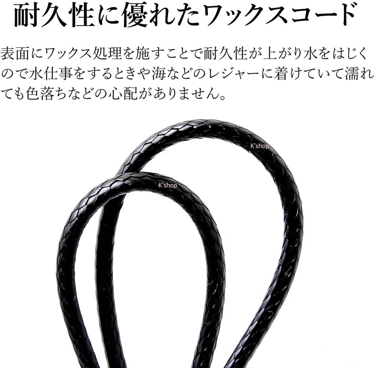 【素材・耐久性】本製品 紐ネックレスの紐は表面にワックス処理が施しているので、耐久性に優れたワックスコードになっています。革やレザーより水や汗に強い素材なのでお風呂はもちろん海やプール、運動など気にせず身に着けることができます。また、色落ちの心配もありません。