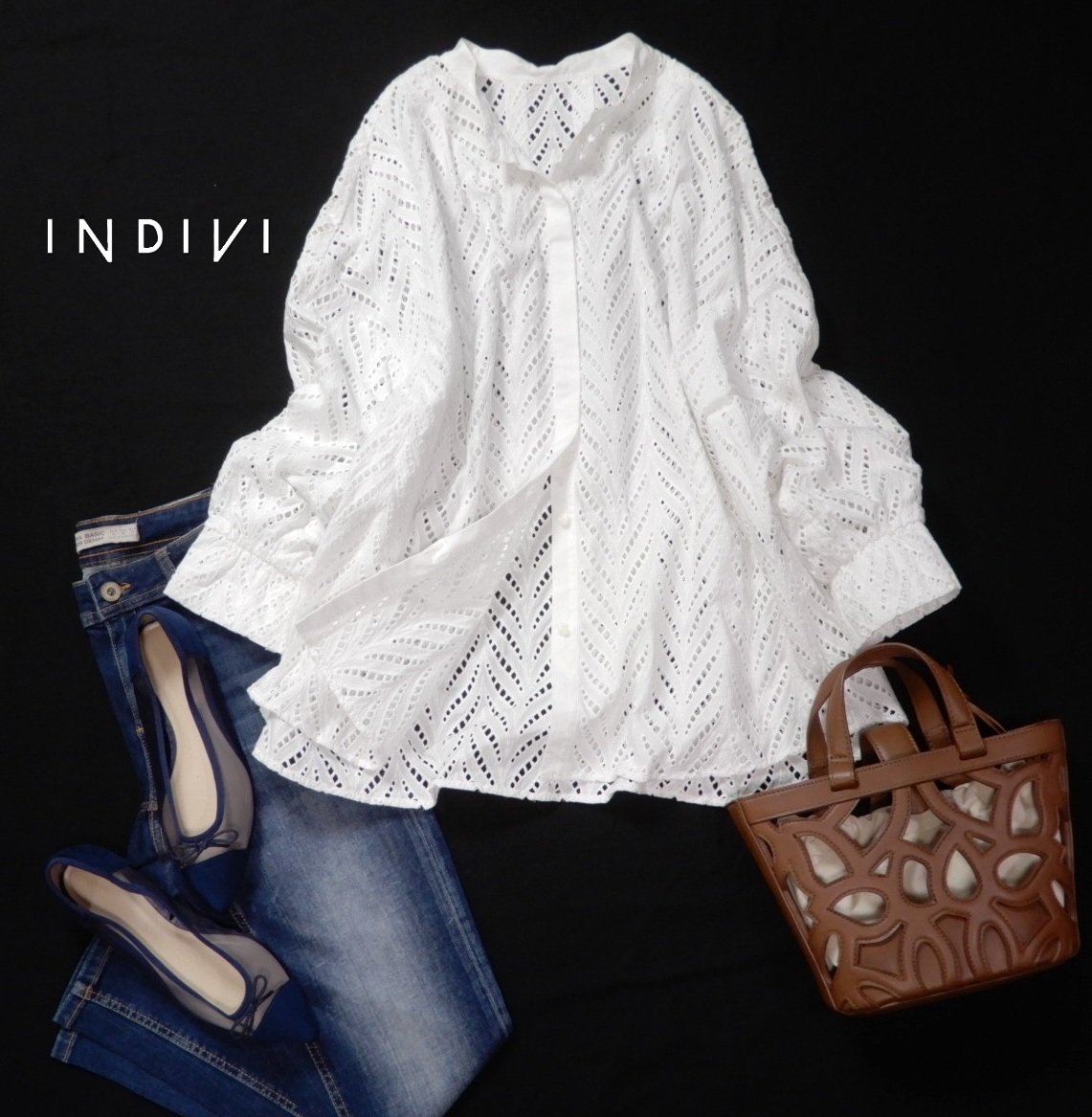 インディヴィ INDIVI 大きいサイズ 13 大人素敵スタイル☆洗える カットワーク刺繍レースデザイン シャツ レイヤードコーデや羽織に