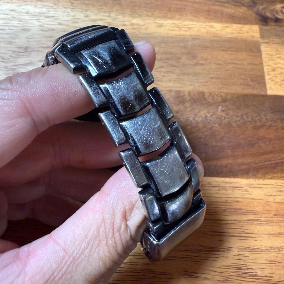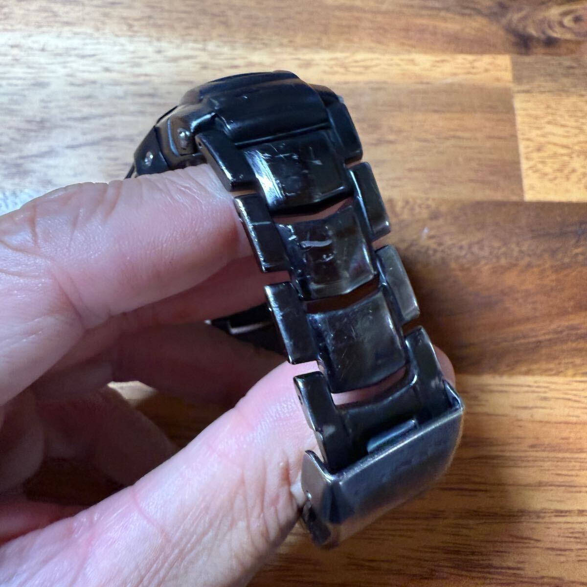 ブラックチタンベルトの状態ですが、傷がおおく状態はあまりよくないです。特にバックル側のメッキの剥がれがひどく、ほとんど残っていない状態です。機能的に問題はないですが、こちらも磨くことができない為そのままです。画像で状態を確認してください。